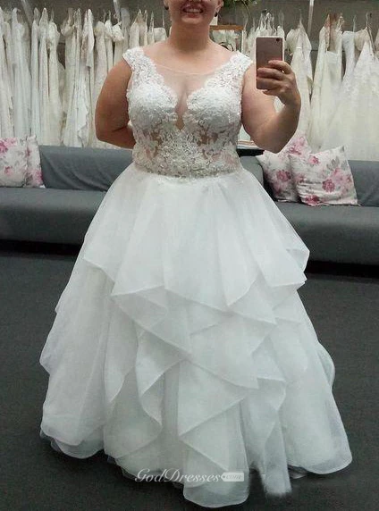 Elegant Plus Size Sleeveless Applique Zipper Ruched Lace Top Bridal Dress