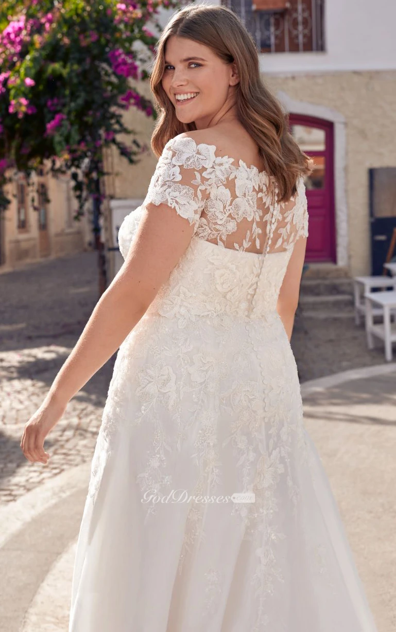 Elegant Satin Floor-length Short Sleeve A Line Open Back Wedding Dress with Appliques
