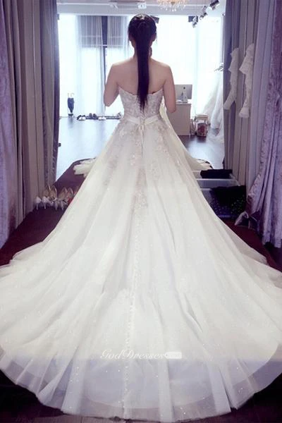 Elegant Sweetheart Beaded Appliques A Line Court Train Wedding Dress
