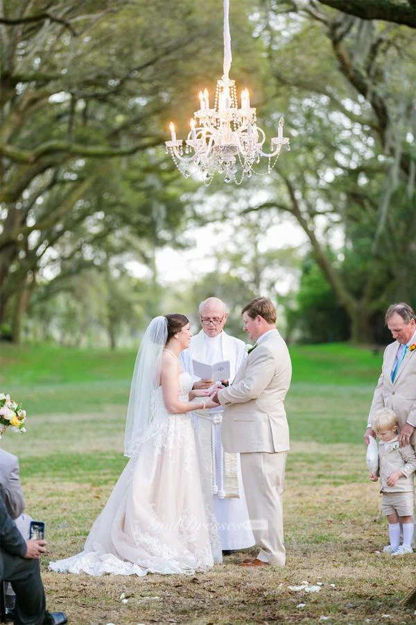 Elegant Sweetheart High Low Blush Wedding Dress with White Lace
