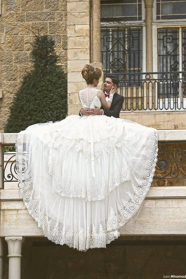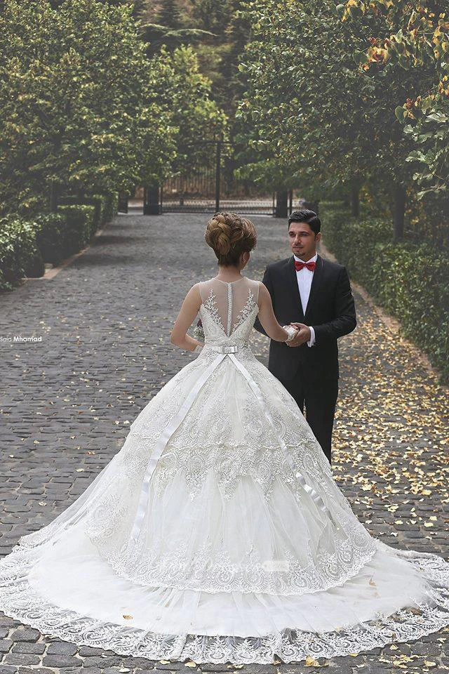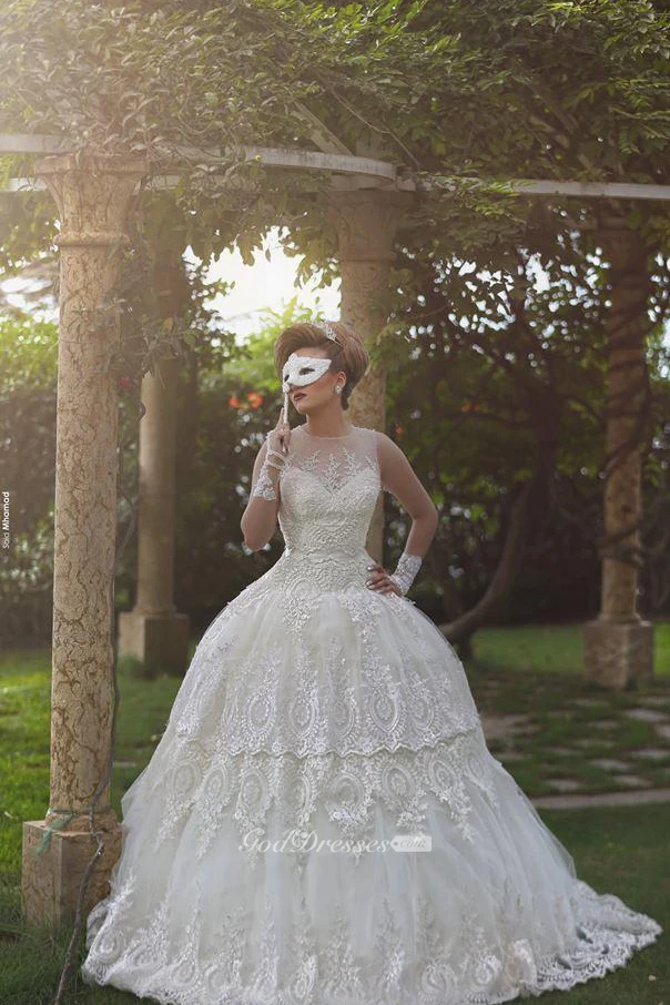 Elegant Tulle Lace Appliques Illusion Wedding Dress Ball Gown Zipper