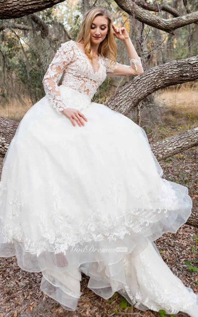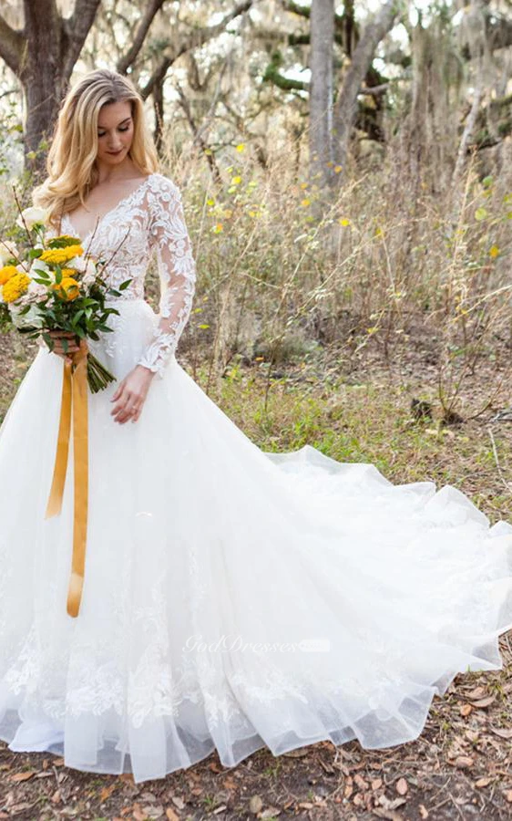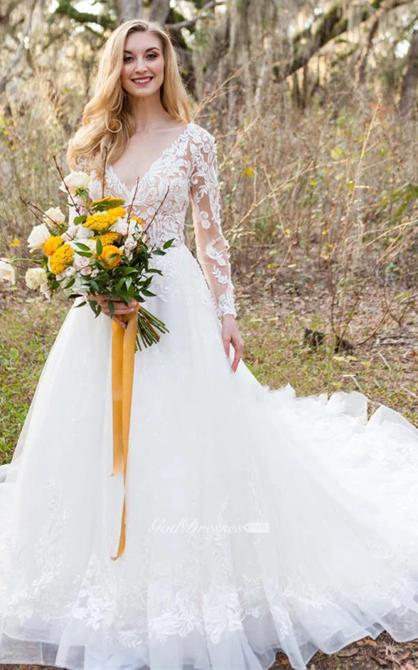 Elegant V-neck A Line Floor-length Court Train Long Sleeve Wedding Dress With Appliques