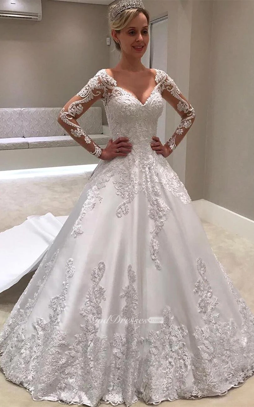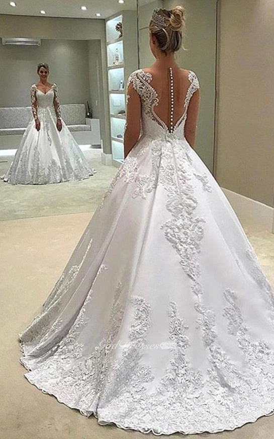 Elegant V-neck Ball Gown Court Train Satin Wedding Dress with Appliques