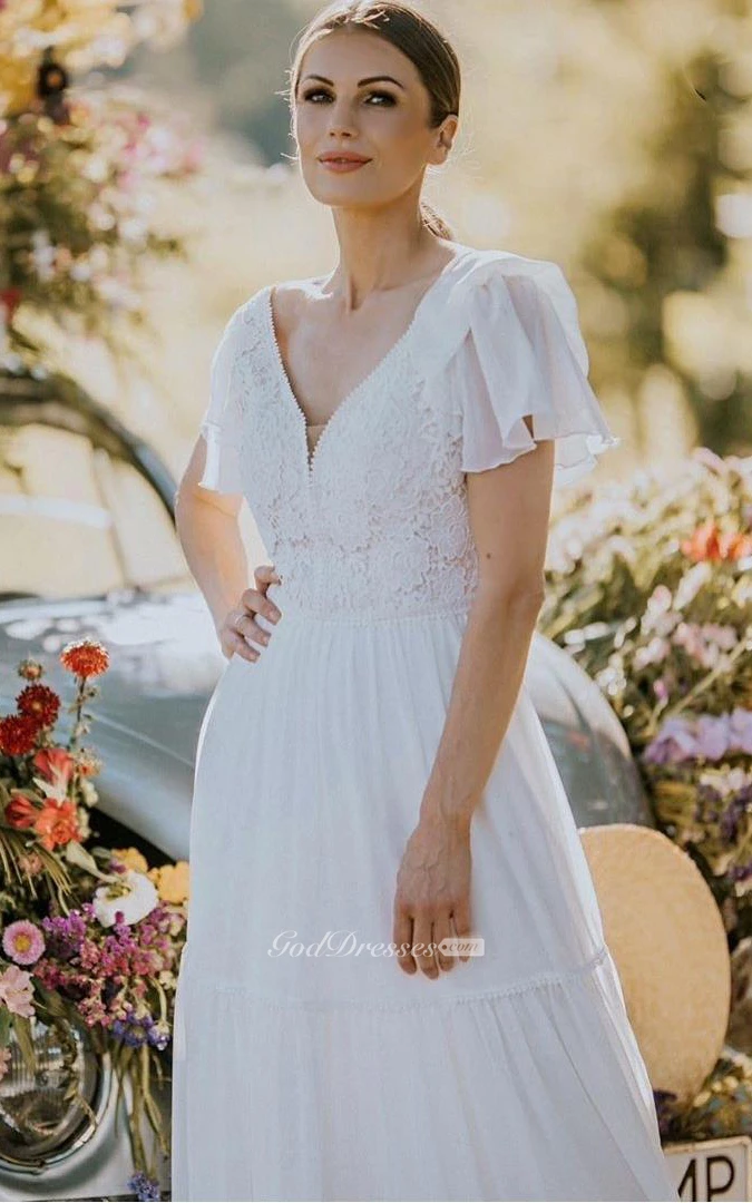 Elegant V-neck Lace A Line Floor-length Short Sleeve Wedding Dress with Ruffles