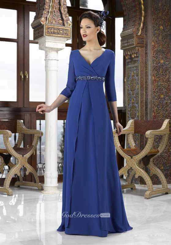 Empire 3-4 Sleeve Jeweled V-Neck Chiffon Mother Of The Bride Dress