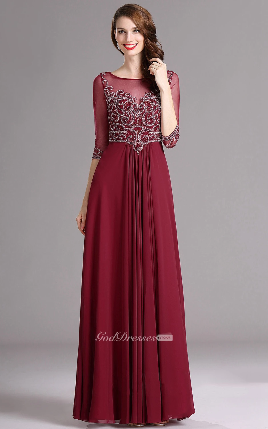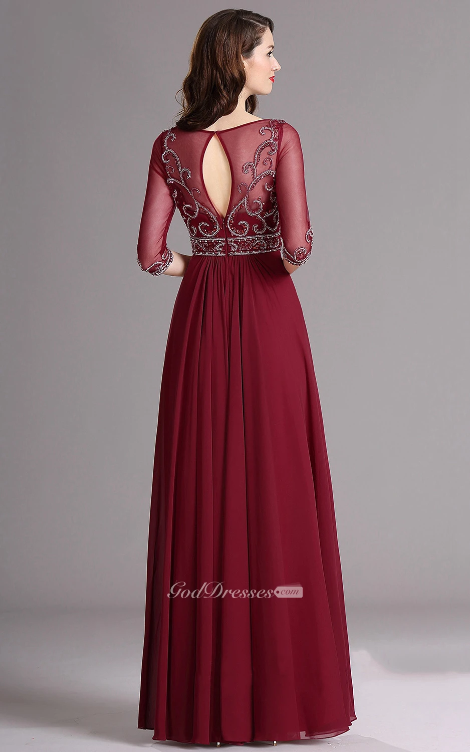 Empire Floor-Length Bateau Half Sleeve Empire Chiffon Beading Keyhole Dress