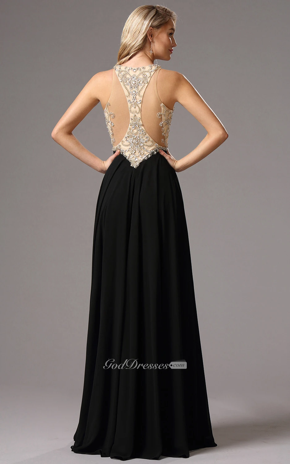 Empire Floor-Length Sweep High-Neck Sleeveless Empire Chiffon Beading Keyhole Dress