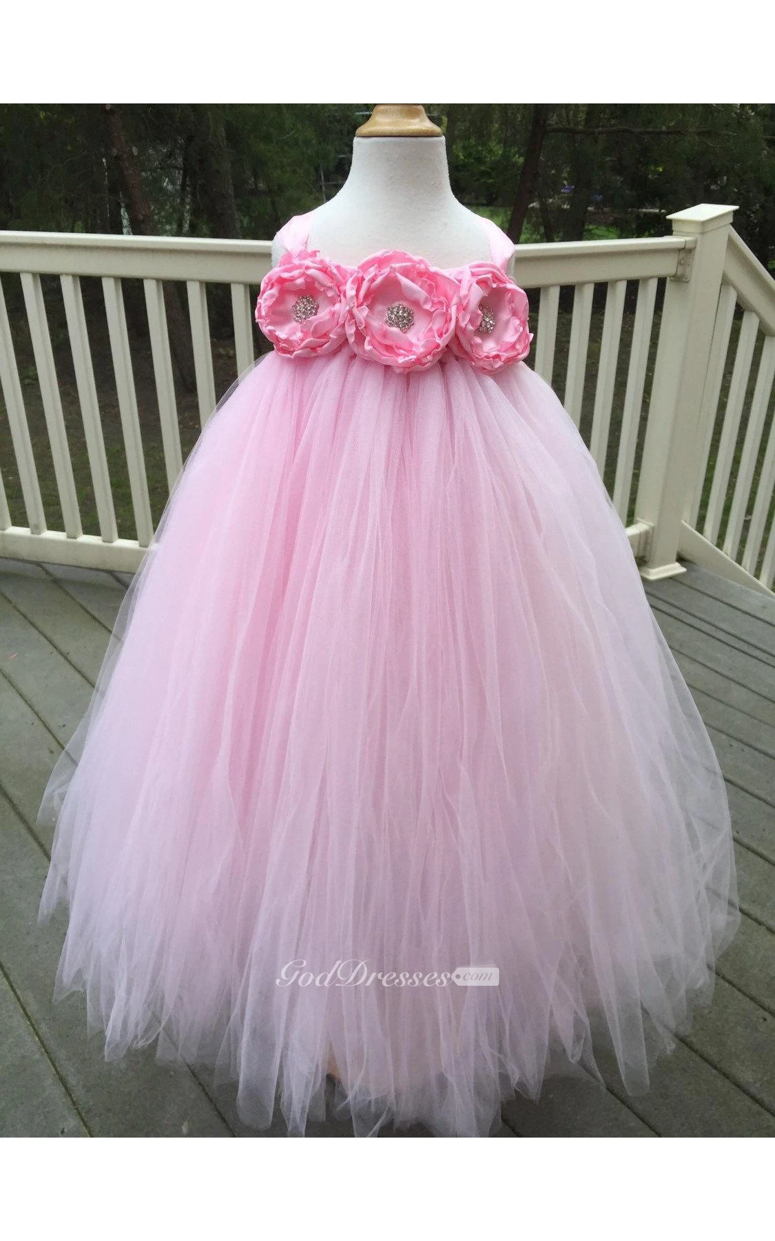 Empire Flower Bodice Pleated Tulle Gown With Ruffles