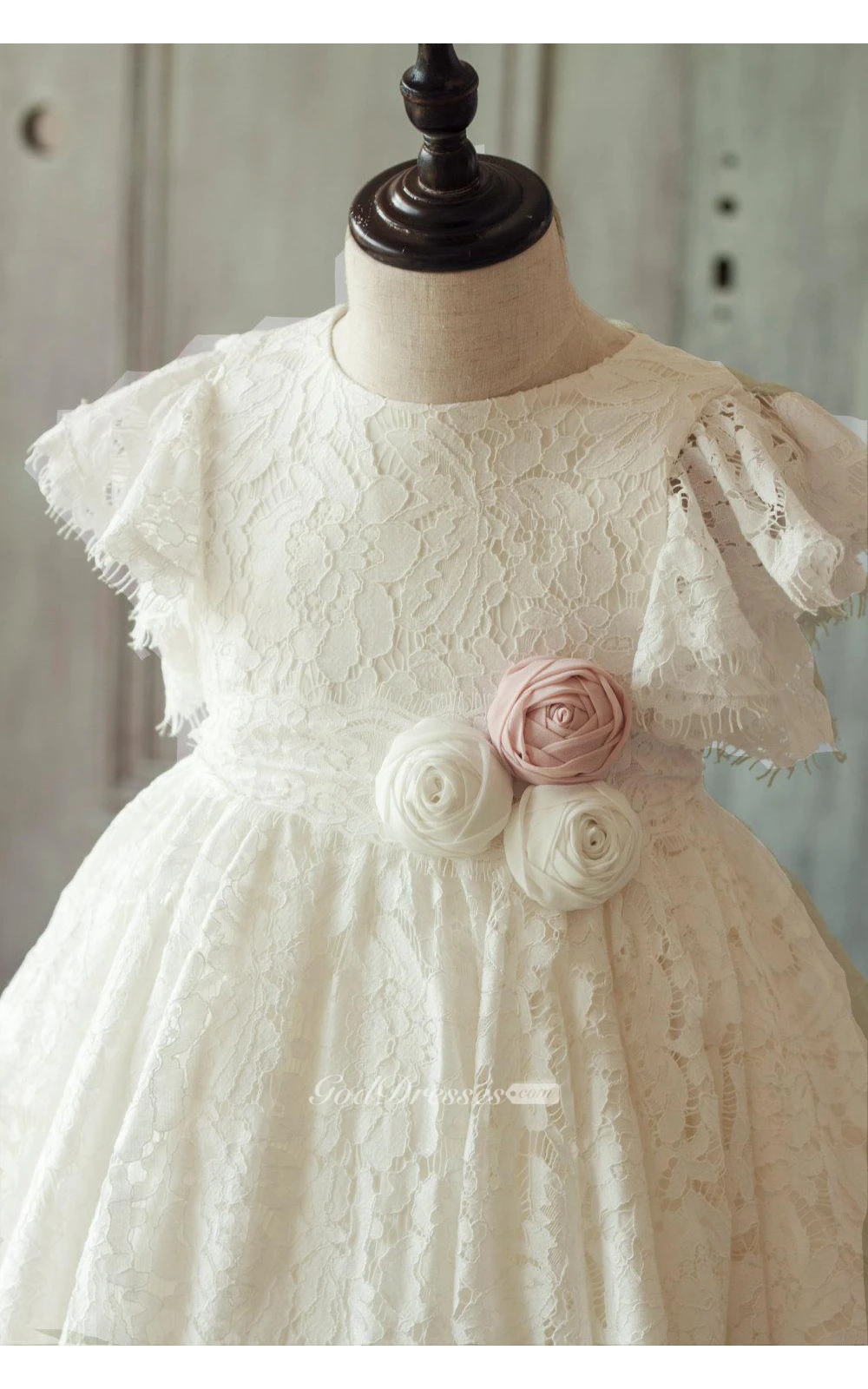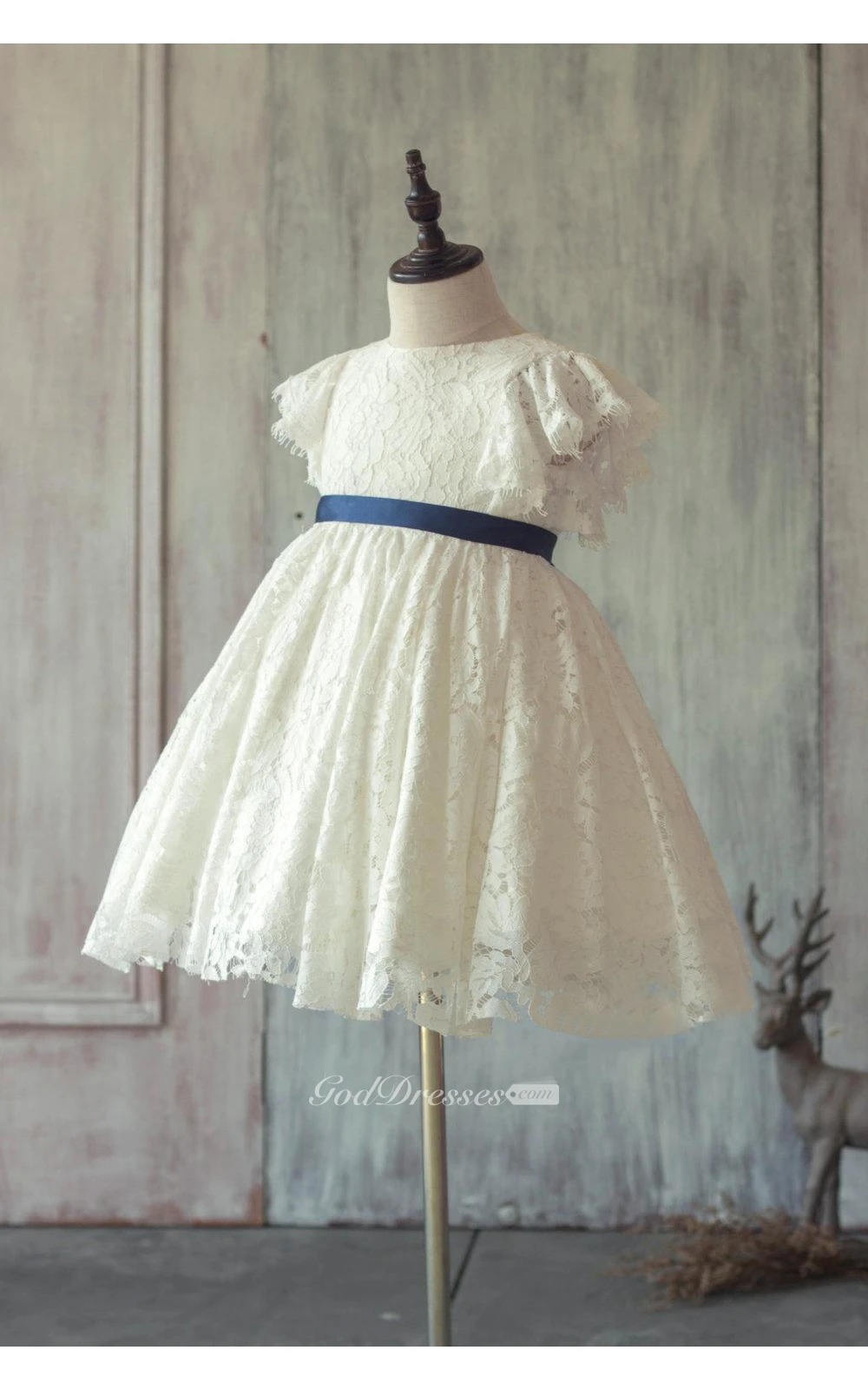 Empire High Neck Ruffle Sleeve A-line Lace Dress With Pleats and Sash