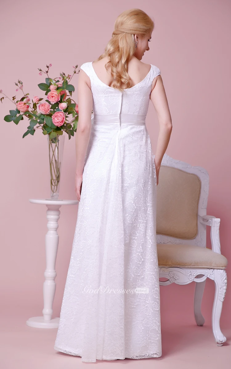 Empire Scoop Neck Cap-sleeved Floor Length Lace Dress With Bow