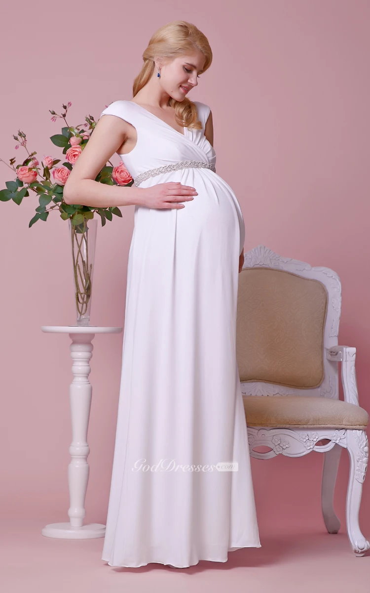Empire V-neck Short-sleeved A-line Jersey Gown With Shiny Waist