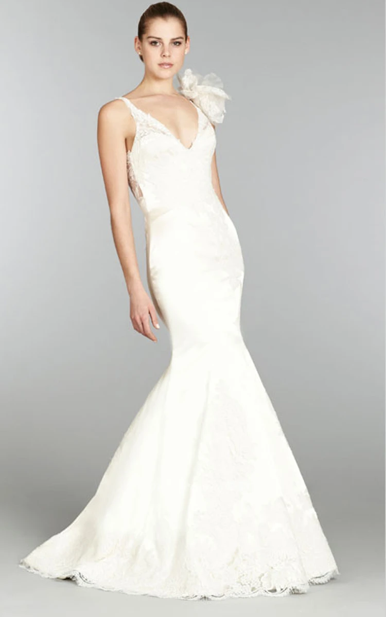 Enchanting V-Neck Lace Bodice Satin Mermaid Dress With Illusion Keyhole Back