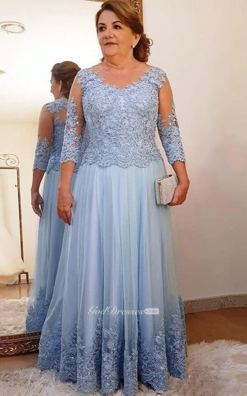 Ethereal 3/4 Length Sleeve Floor-length Lace A Line Mother of the Bride Dress with Appliques