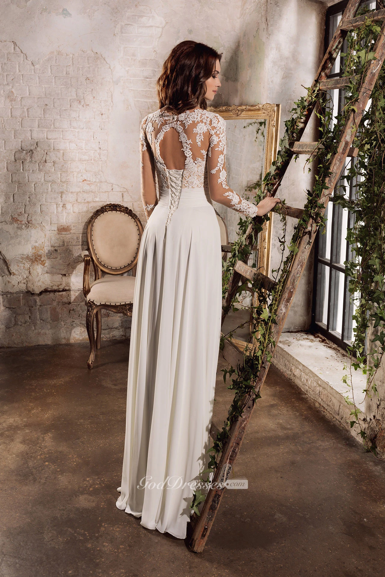 Ethereal Chiffon and Lace V-neck Floor Length Wedding Dress with Keyhole Back