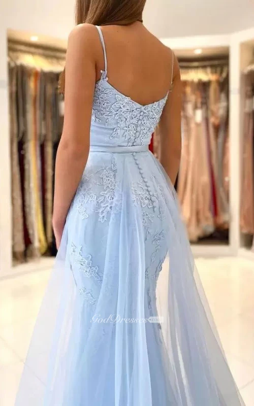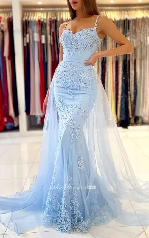 Ethereal Mermaid Spaghetti Floor-length Sleeveless Lace Prom Dress with Removable Skirt