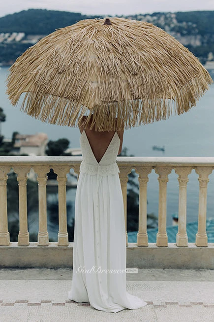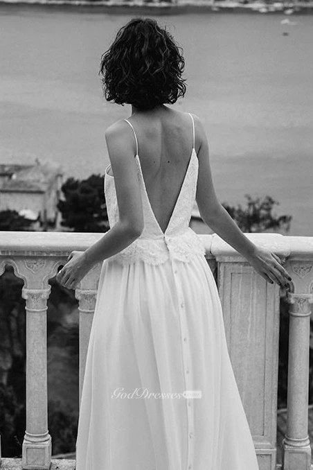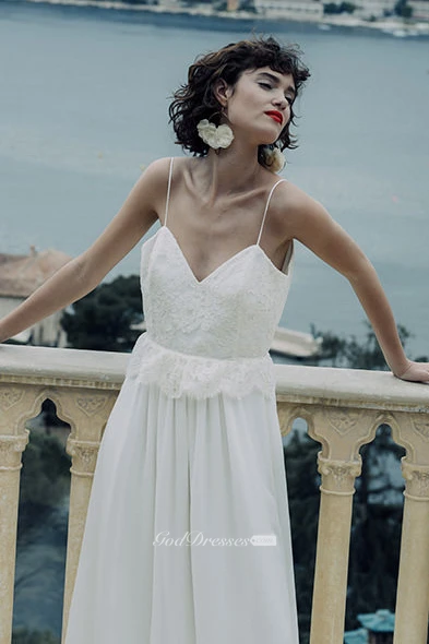 Ethereal Sheath Chiffon Spaghetti Deep-V Back Long Wedding Dress