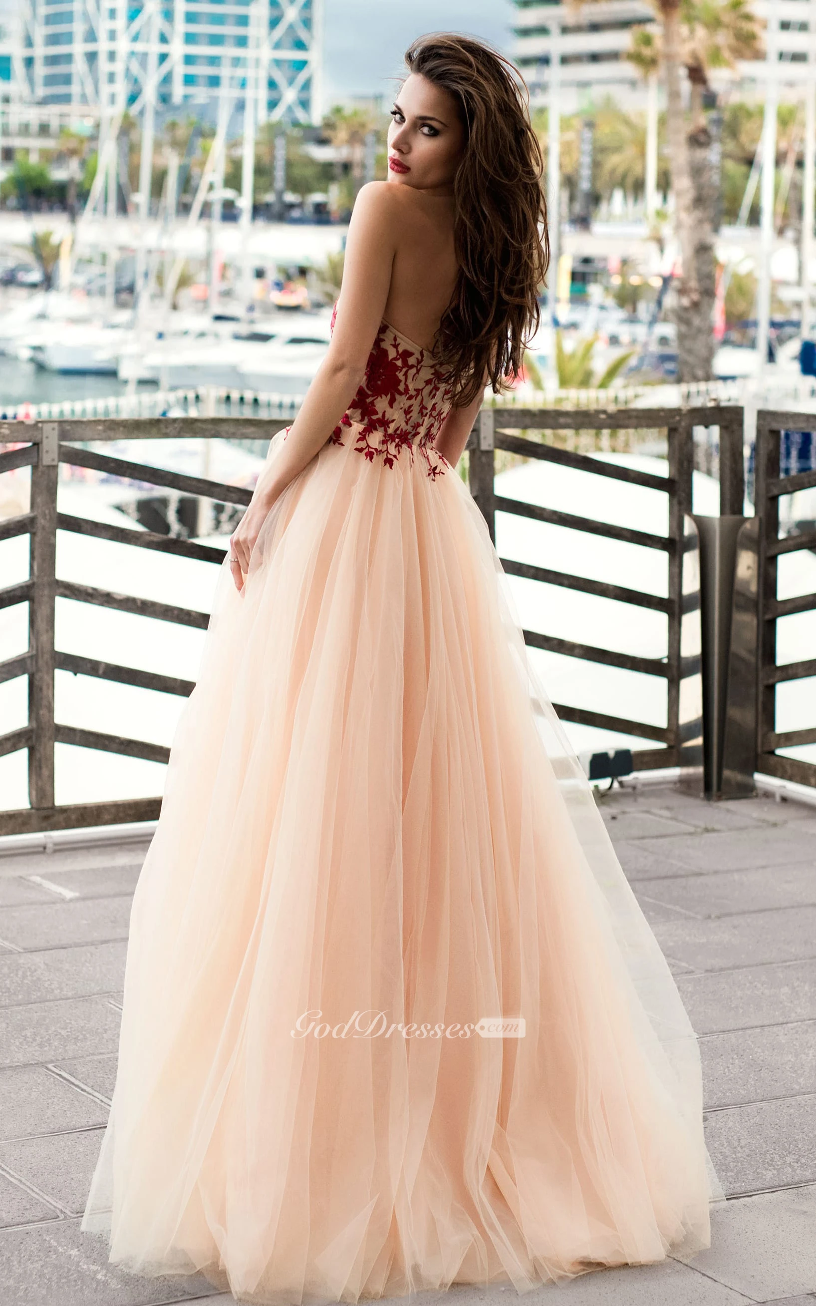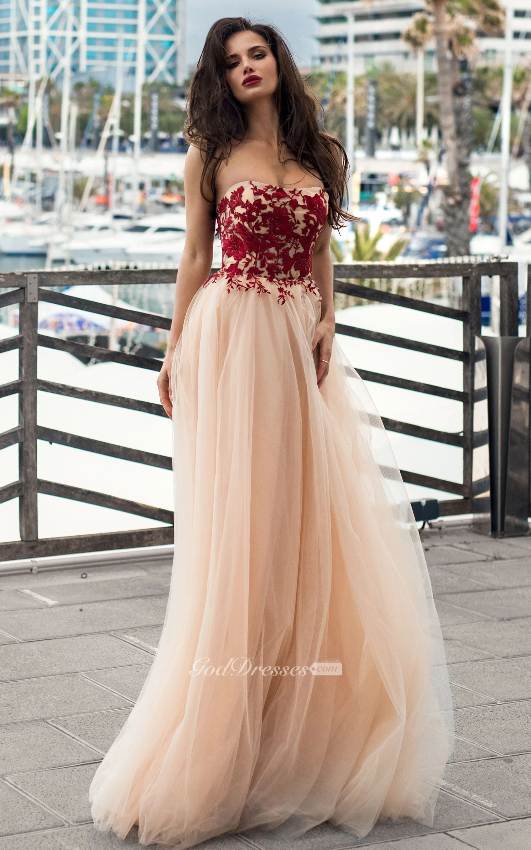 Ethereal Strapless Lace Tulle A Line Sleeveless Floor-length Prom Dress with Appliques