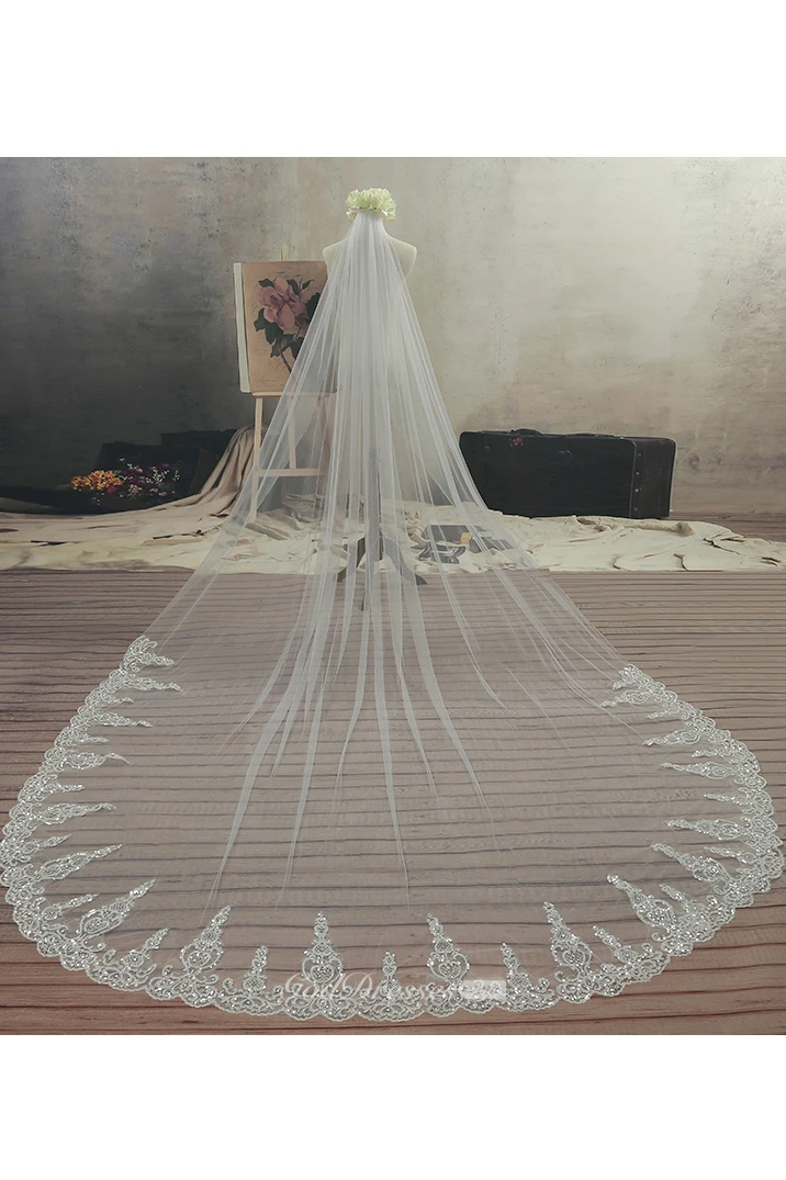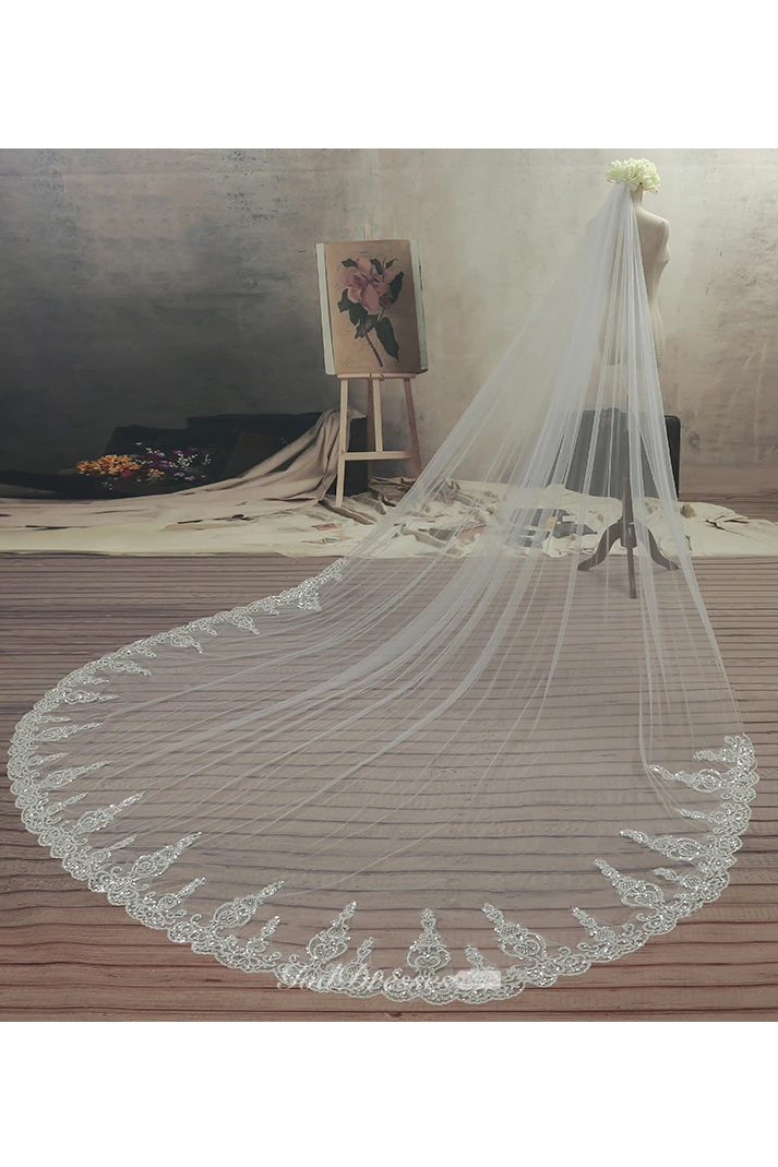 Ethereal Style Cathedral Tulle Wedding Veil with Lace Edge
