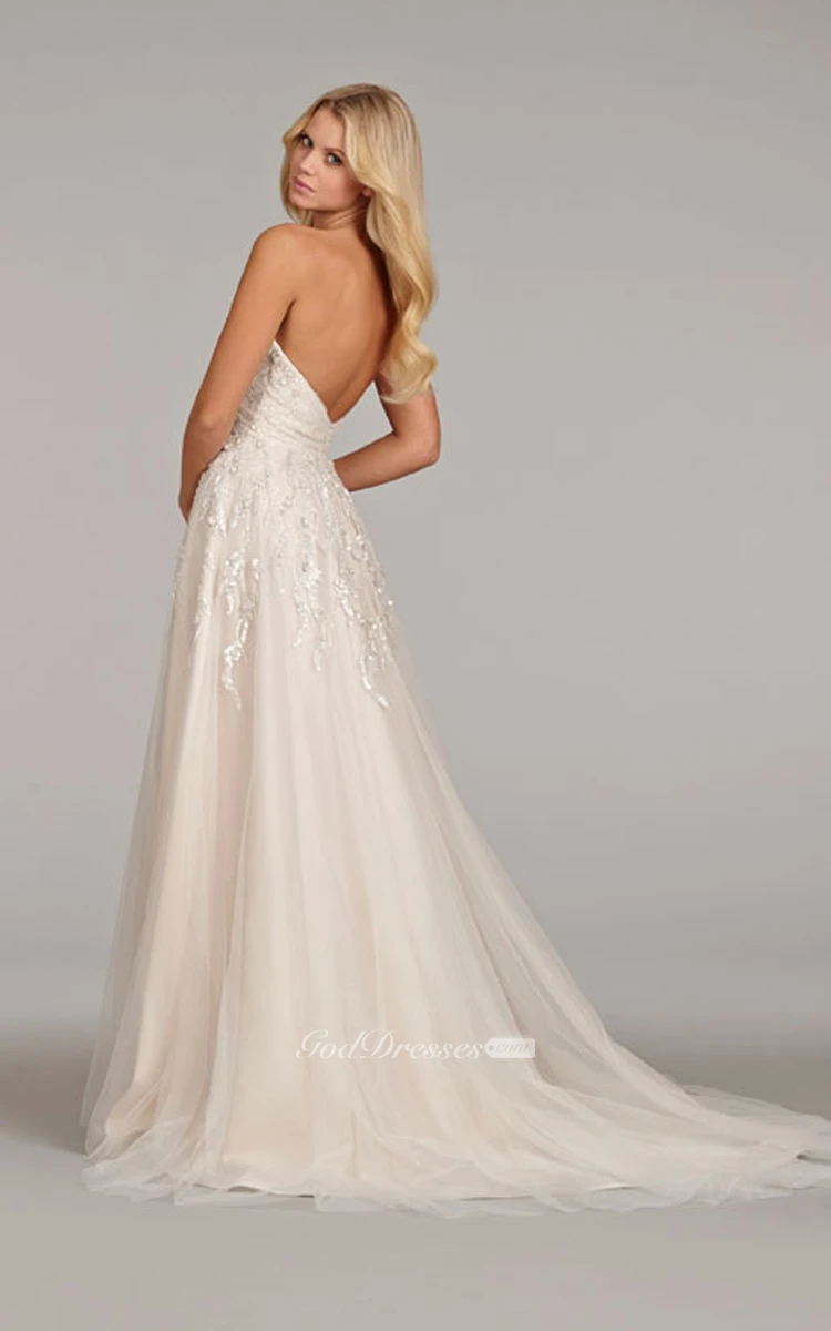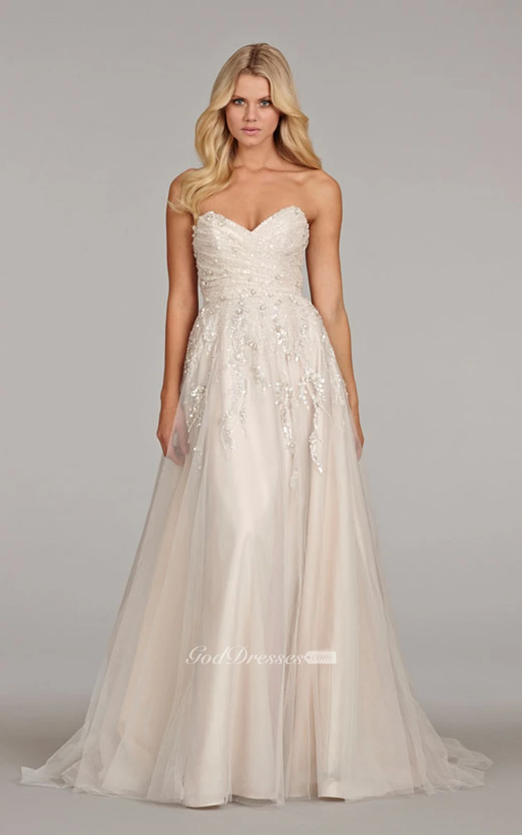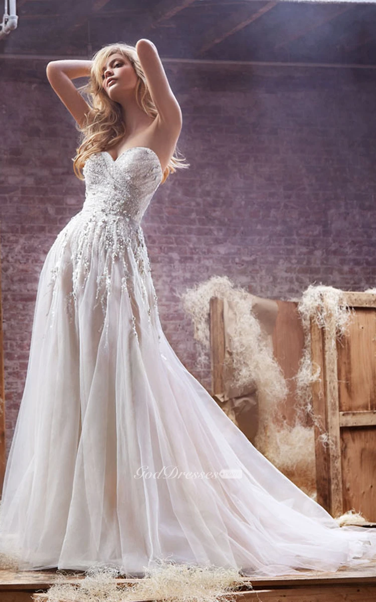 This tender tulle gown will surround you with a warm starry shining by its misty vapory ruched A-line floor length skirt with a long chapel train behind and sparkling pearl and crystal beading artistically adorning the bodice and top of the skirt. Strapless sweetheart neckline pleated bodice wraps you in a surplice design and features the comfy built-in supportive molding cups.