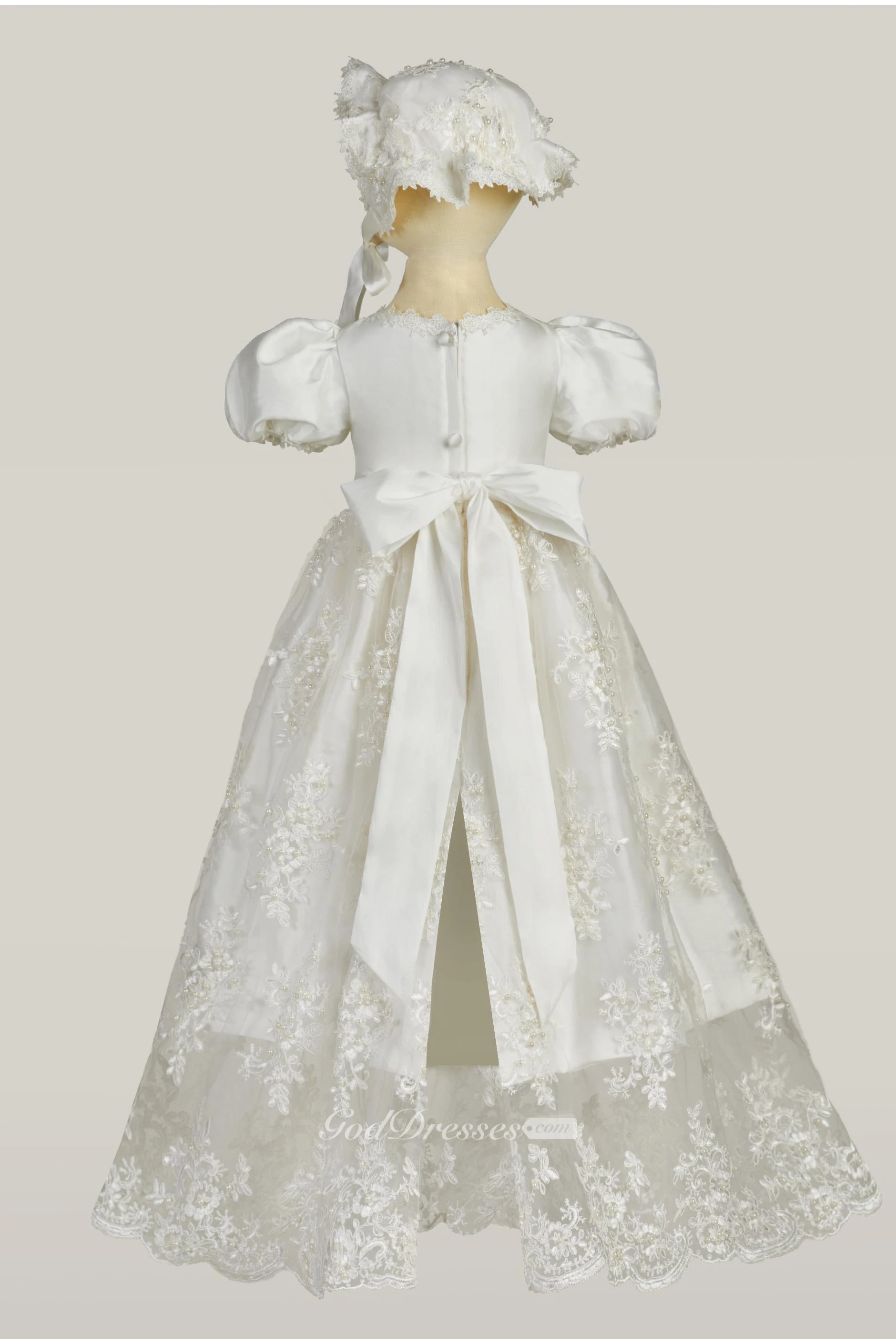 Fancy Puff Sleeve Christening Dress With Lace Appliques