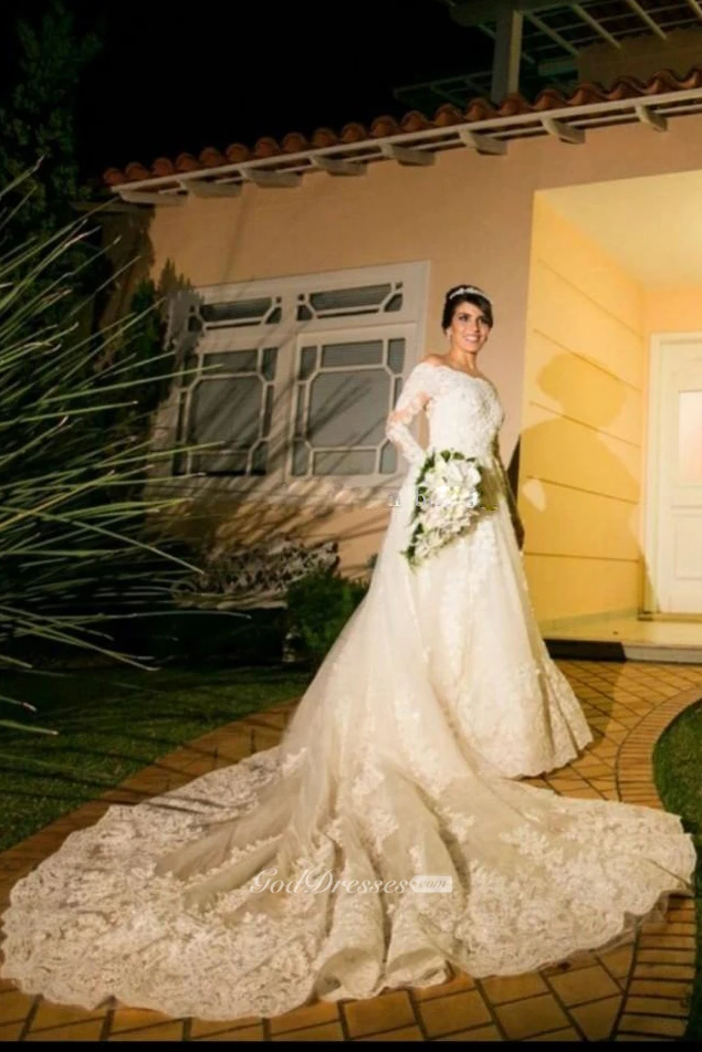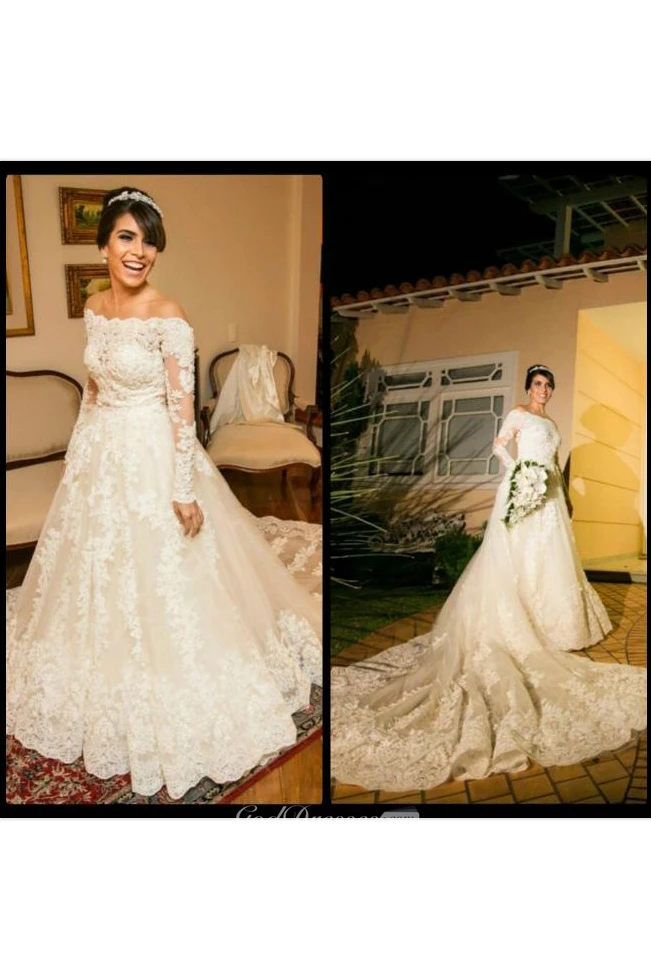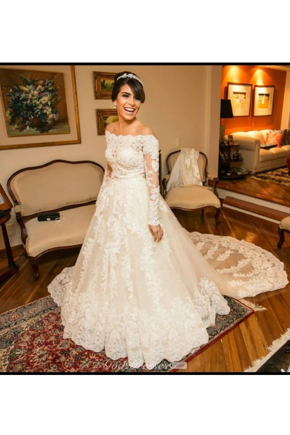 Fashion Off Shoulder Neck Long Sleeve Wedding Dress With Appliques