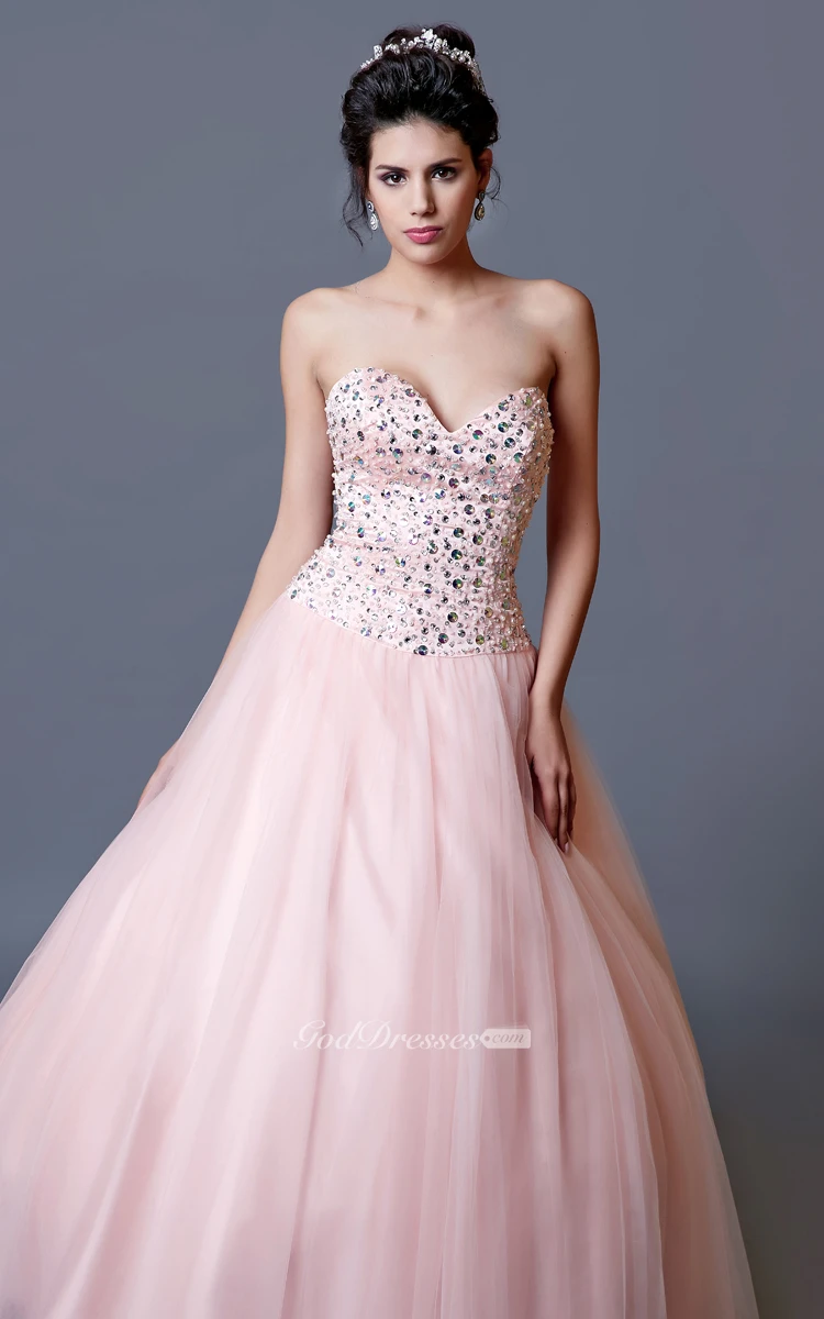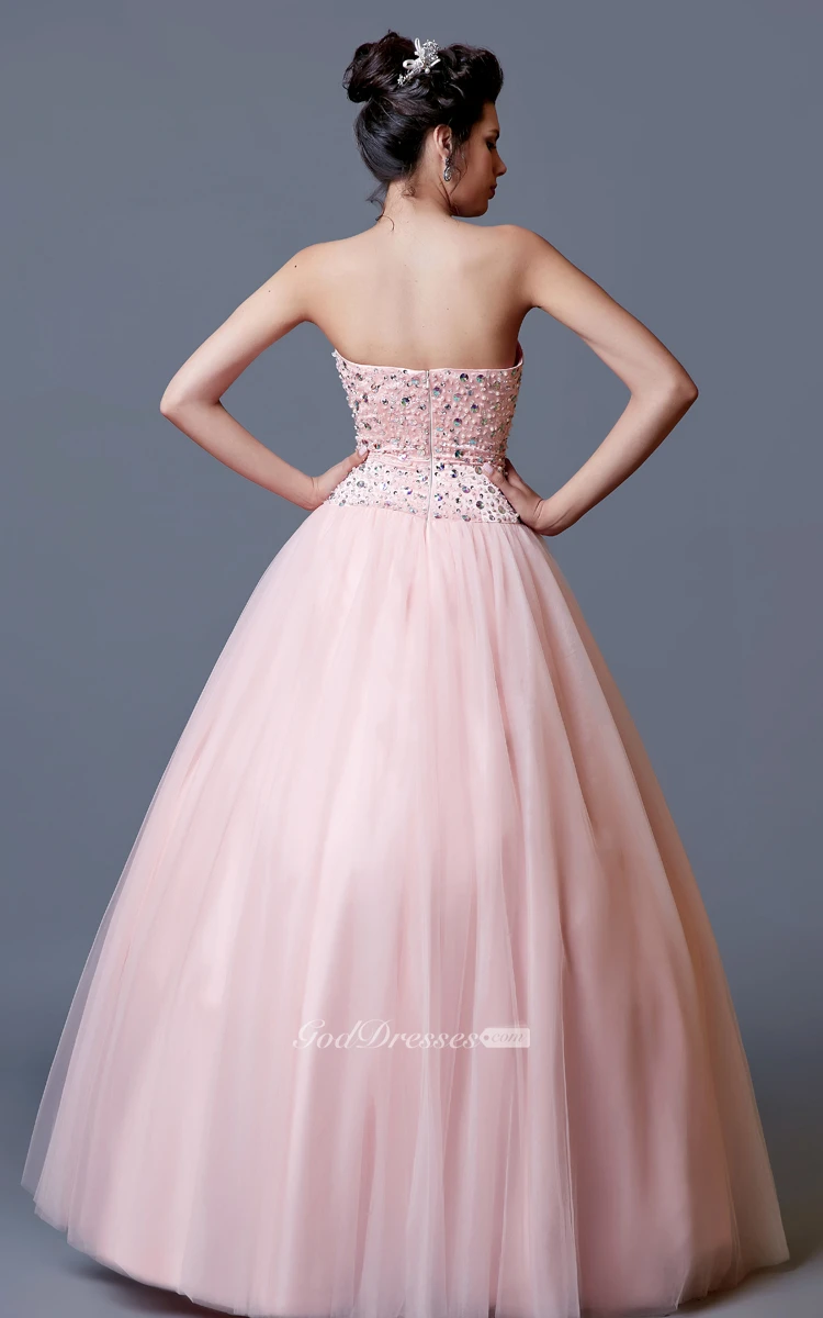 A full flowing ball gown with a quinceanera skirt. This strapless dress has a sweetheart neckline that contours around to create a low cut backline. The snug fitting bodice is made from a sumptuous satin, further embellished with shimmering sequined details. A fine mesh tulle covers the full skirt line. The back is finished off with a zipper fastening. Fitted with a boned bra for added comfort.