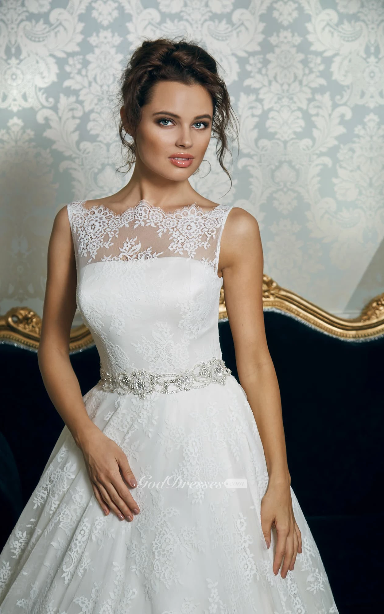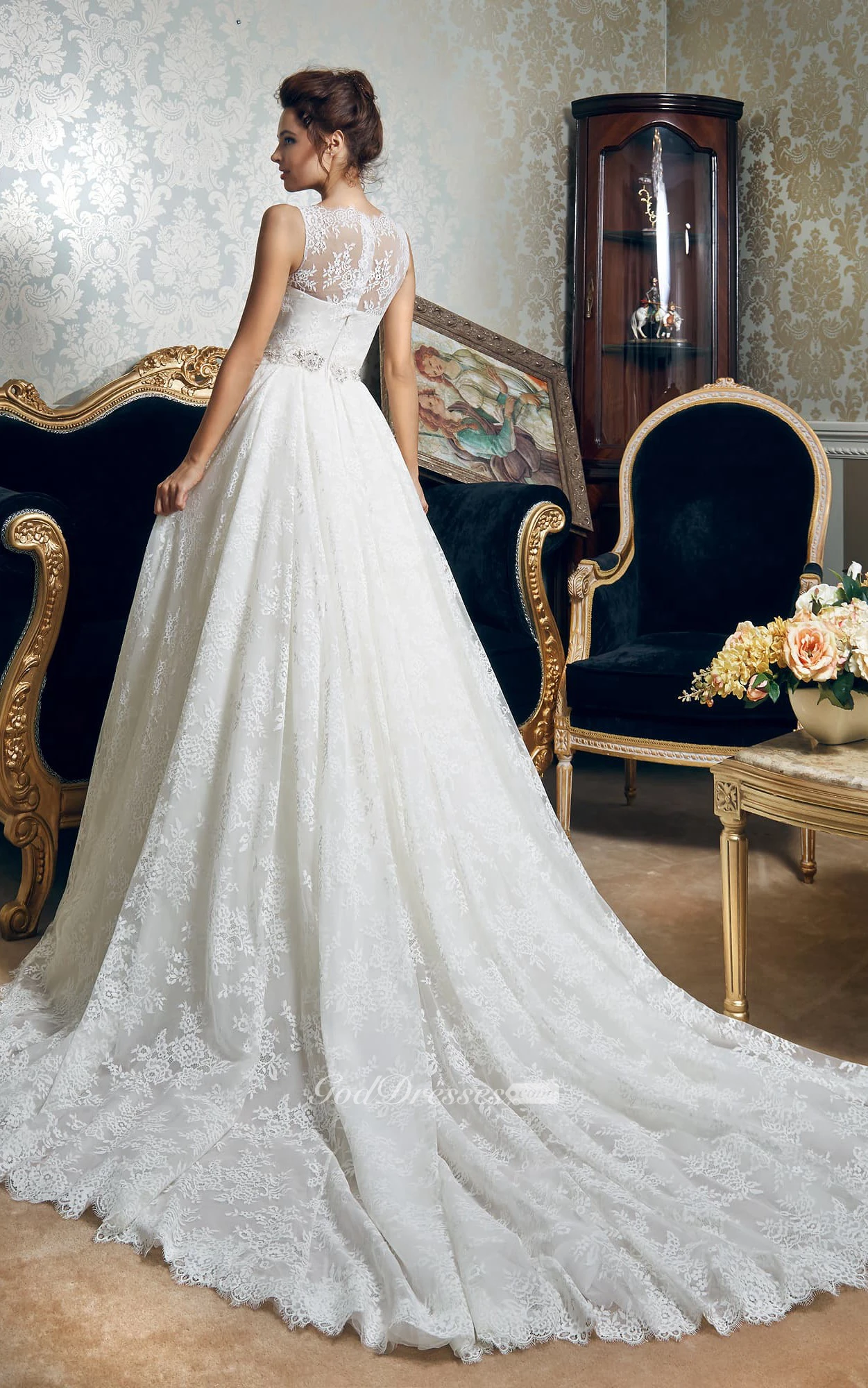 Floor-length A-line Sleeveless Bateau Lace Dress With Crystal Detailing&Long Train