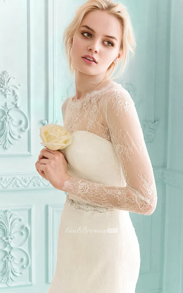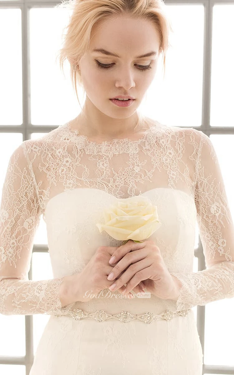 Floor-length Illusion Long Sleeve Lace Dress With Crystal Detailing