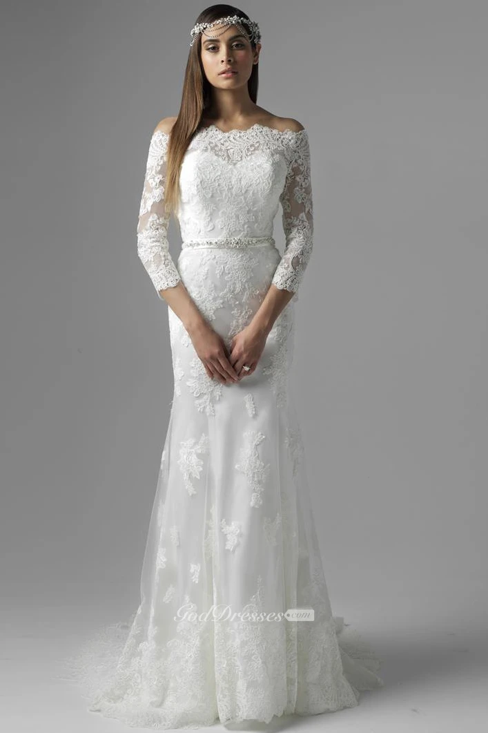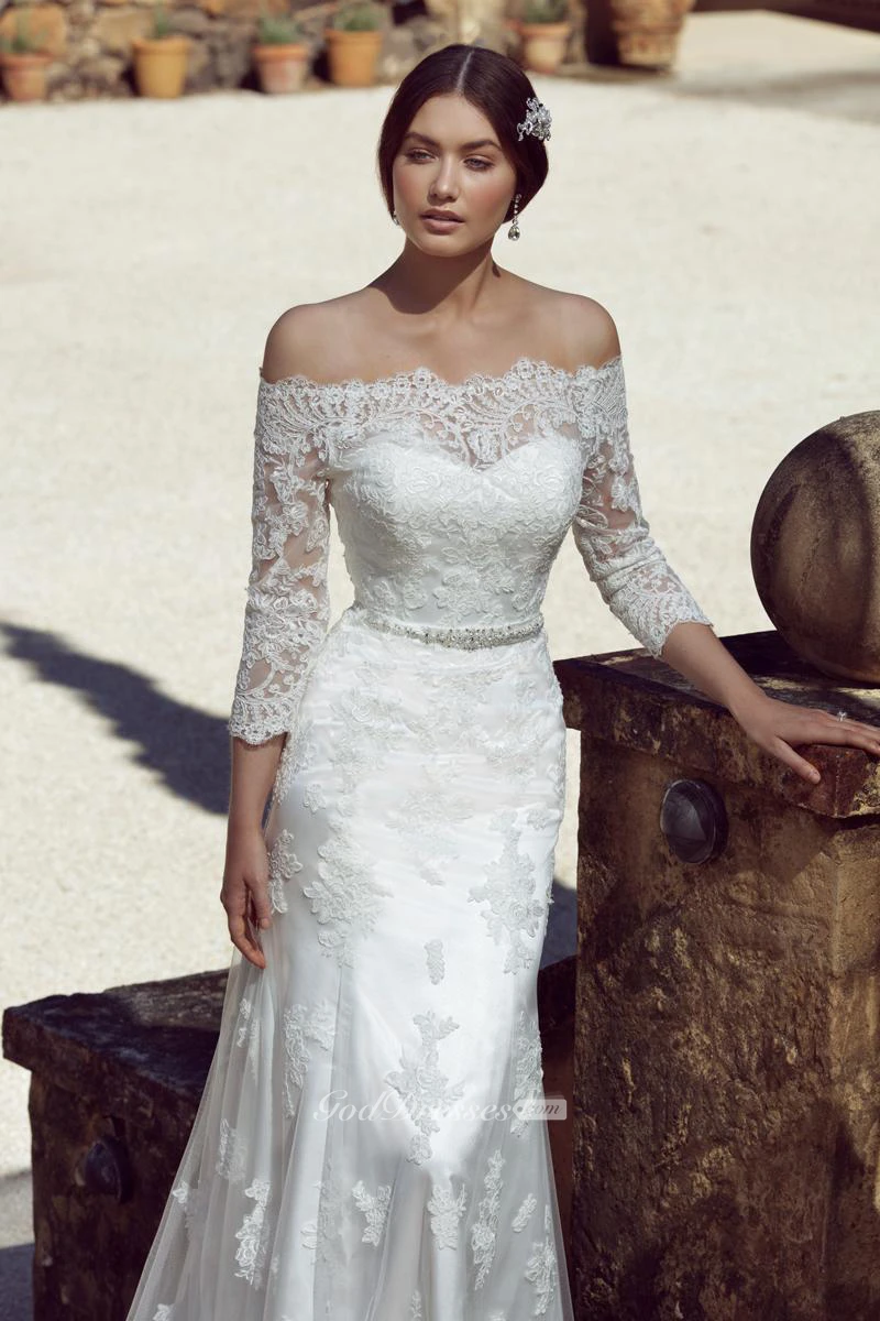 Floor-Length Jeweled Off-The-Shoulder 3-4 Sleeve Lace Wedding Dress