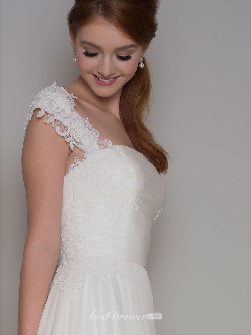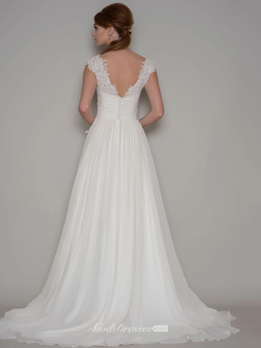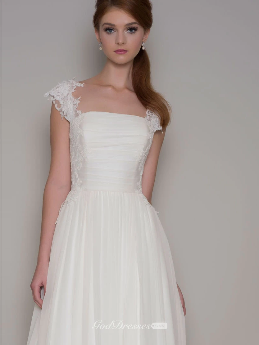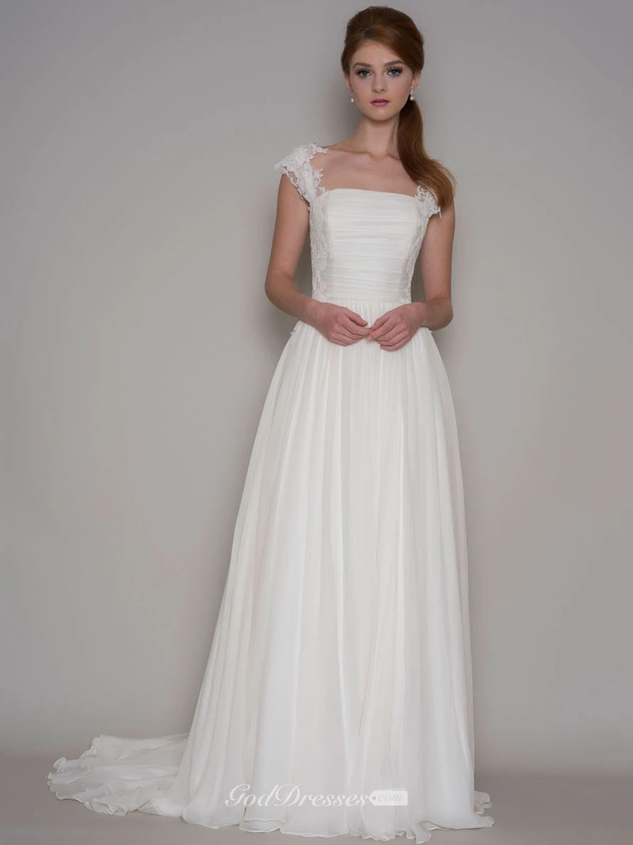 Floor-Length Ruched Cap-Sleeve Square-Neck Chiffon Wedding Dress With Lace And Pleats