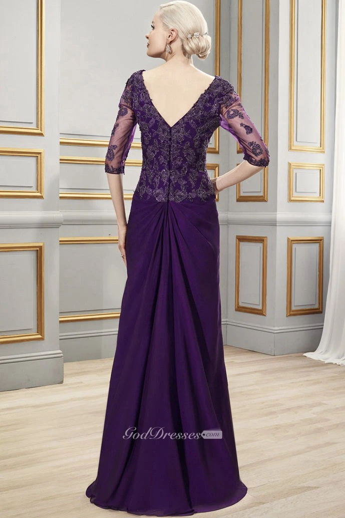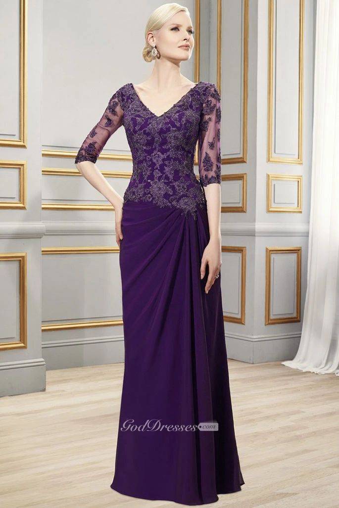 Floor-Length V-Neck Half Sleeve Appliqued Chiffon Formal Dress With Draping