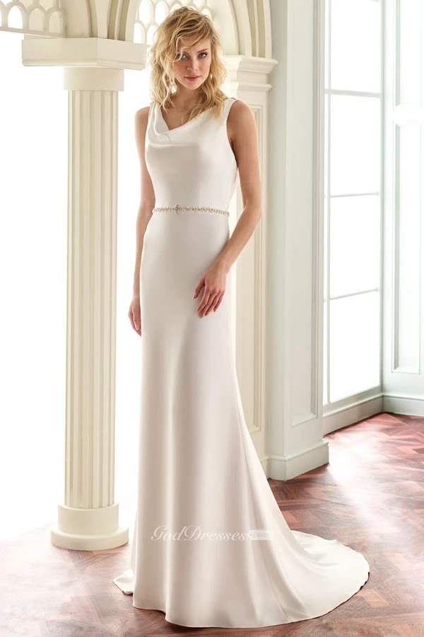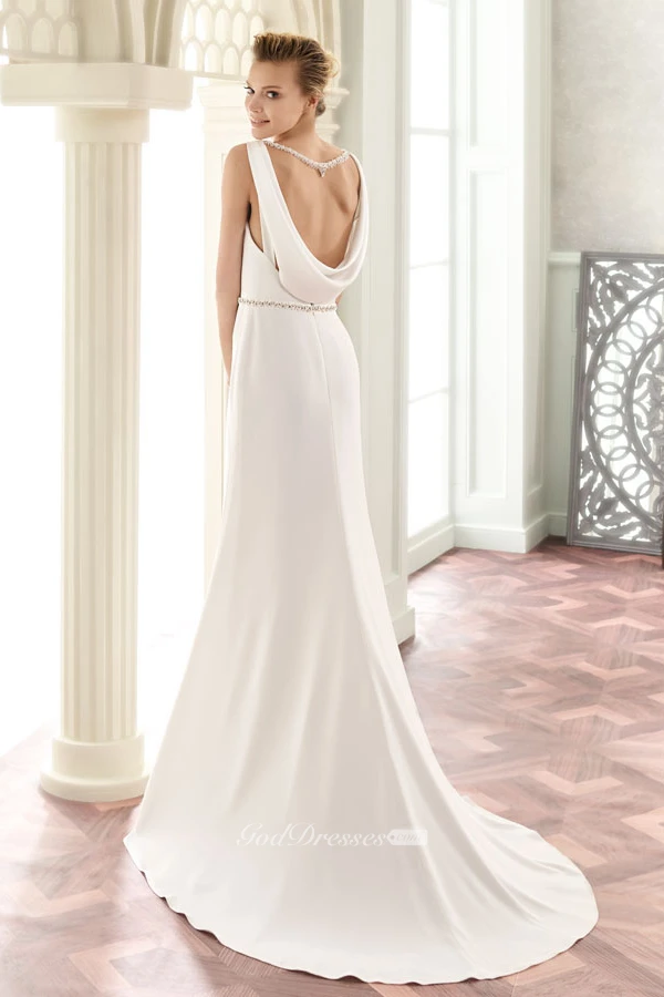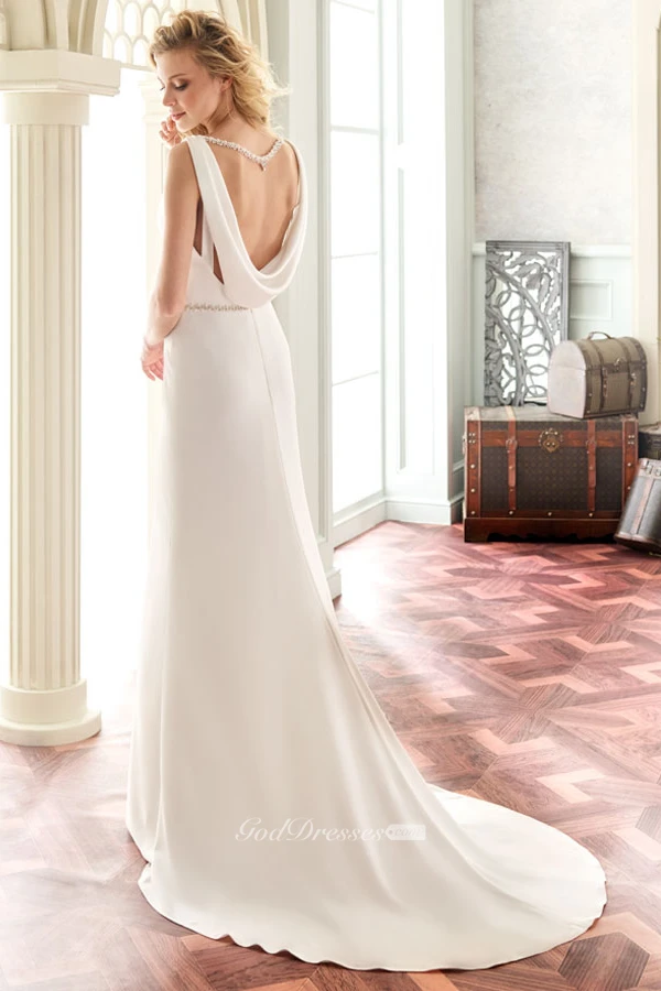 Floor-Length V-Neck Jeweled Satin Wedding Dress With Brush Train And V Back