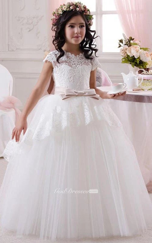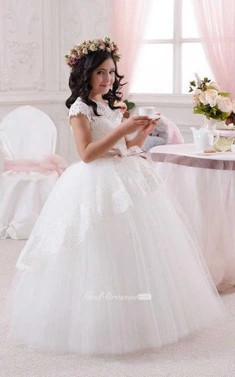 Flower Girl Princess Scalloped Neck Tulle Ball Gown With Lace