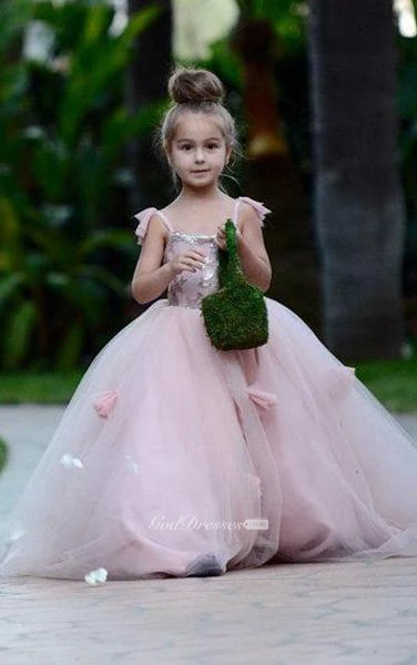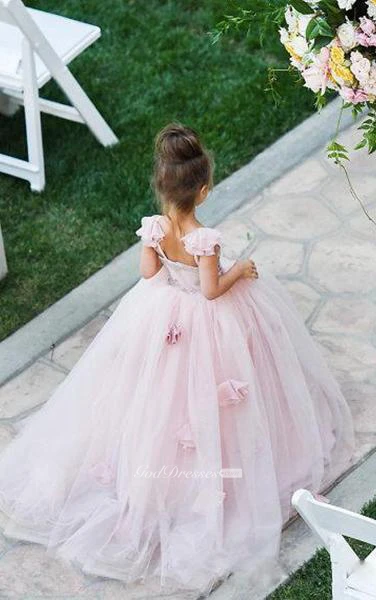 Flower Girl Spaghetti Straps Tulle Ball Gown With Flowers