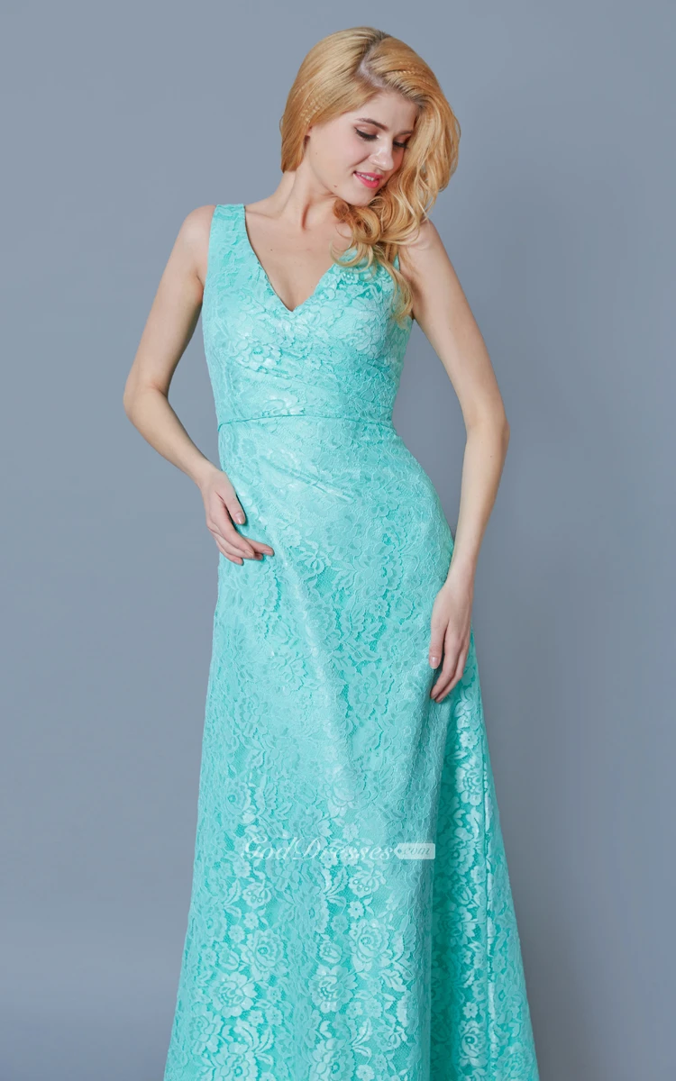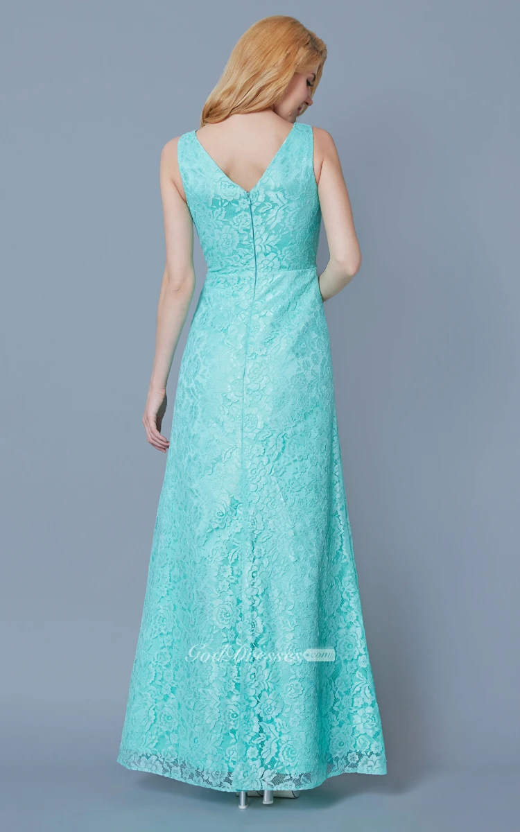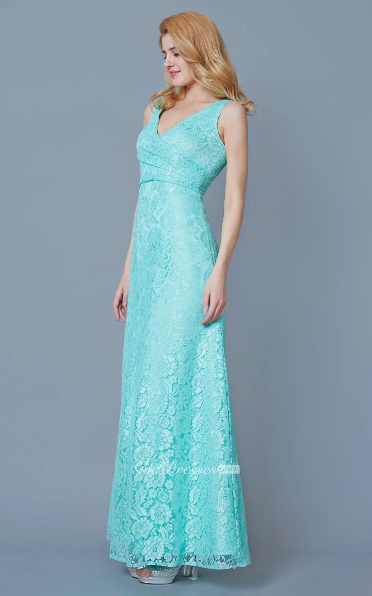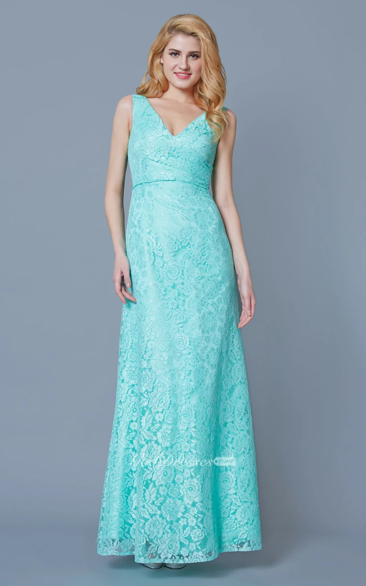 Form Fitted Sleeveless Long Lace Dress With Ruching