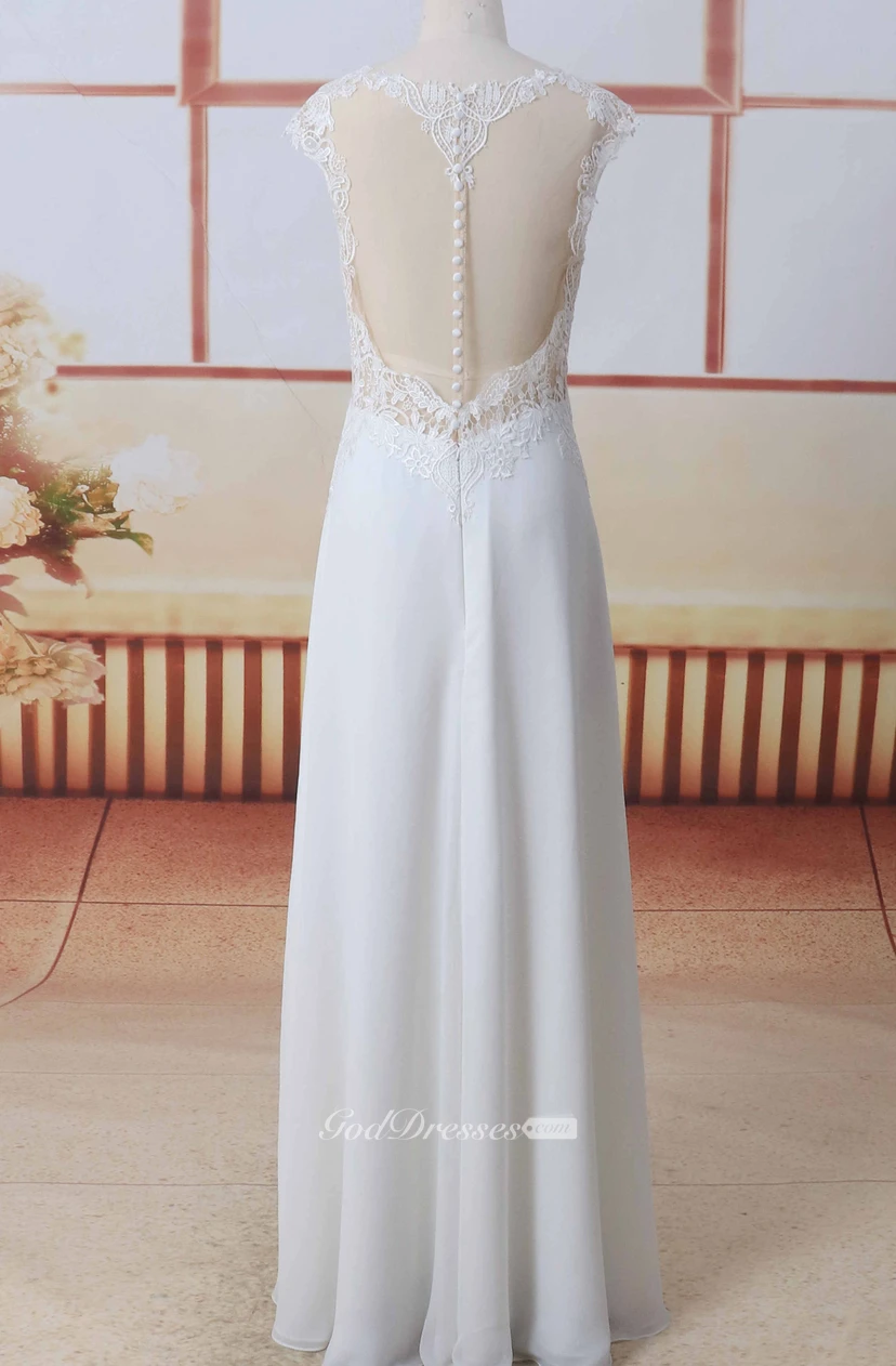 Front Split Lace Chiffon A-line Wedding Dress In Cap Sleeves And Scoop Neck With Illusion Button Back