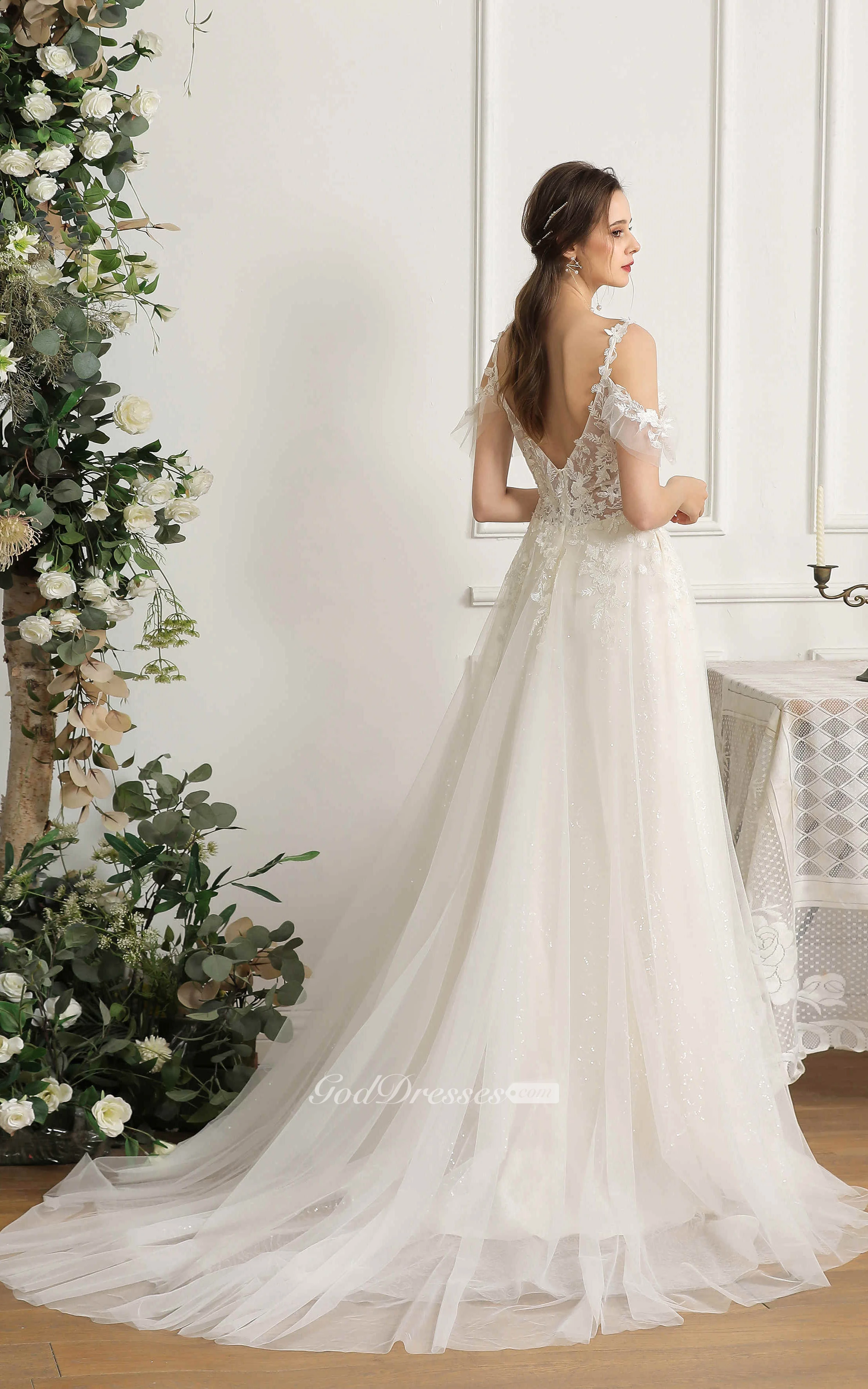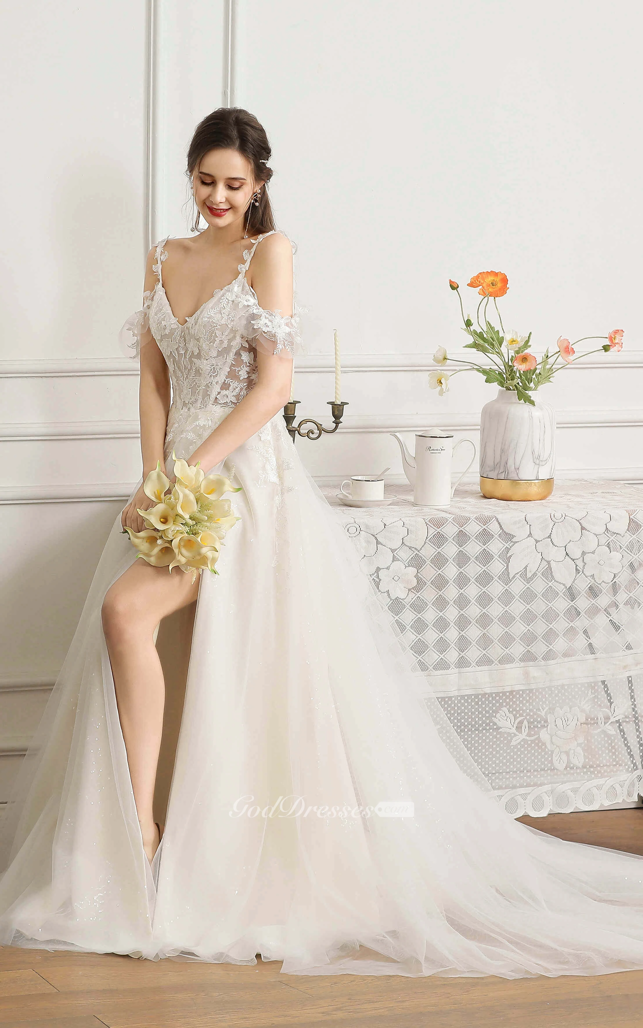 Front Split Sexy Wedding Dress With Straps And Off-the-shoulder sleeves With Boning And Lace Appliques