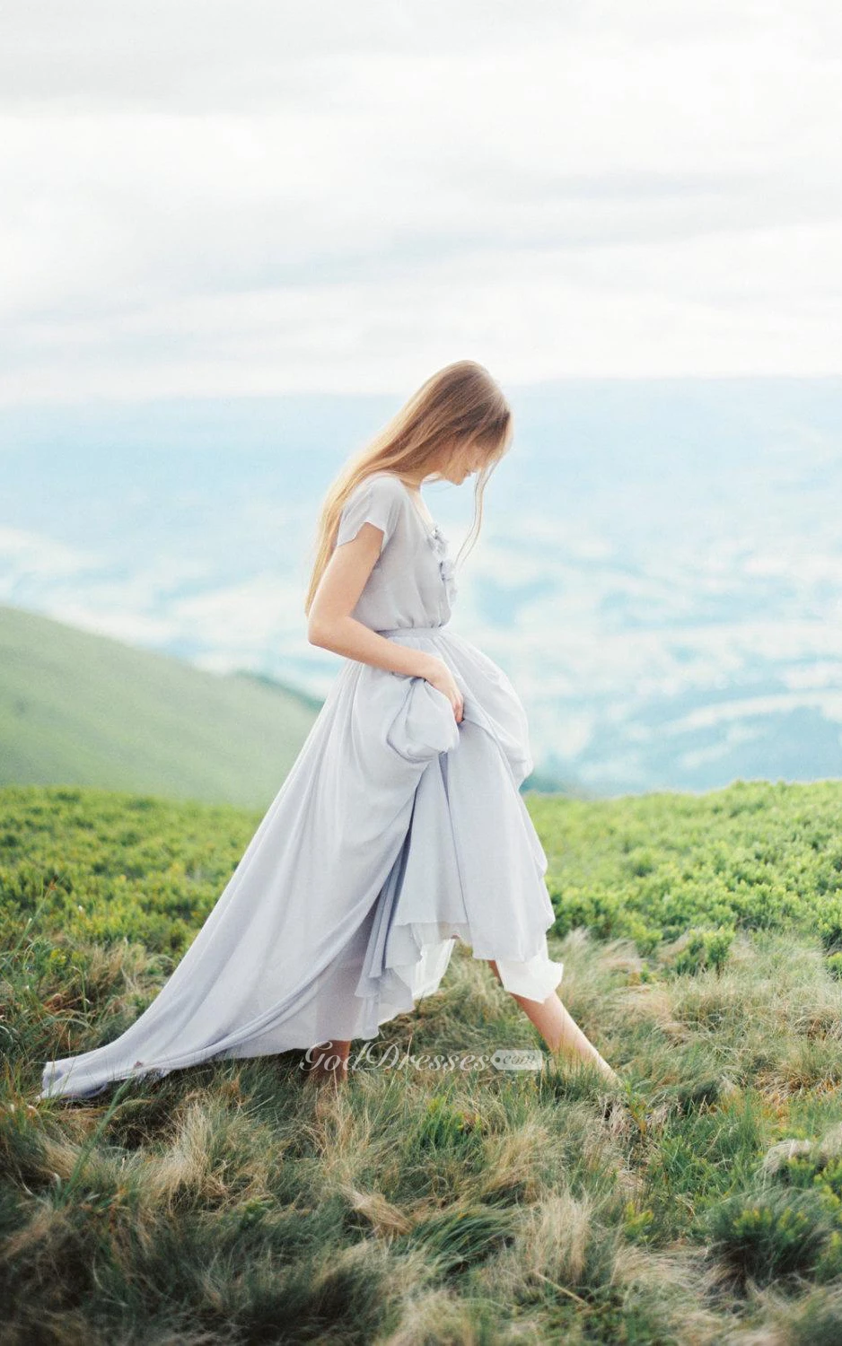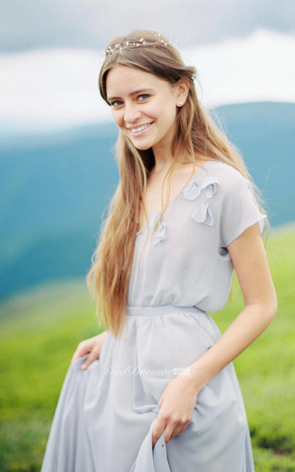 Vintage Short Sleeve Chiffon Dress With Flowers And Pleats