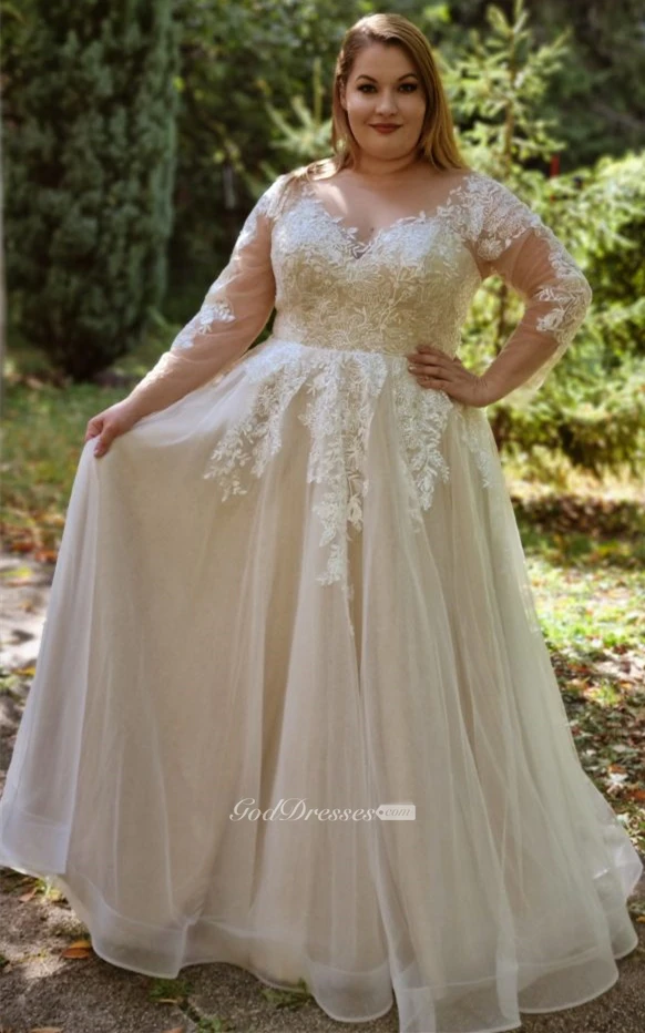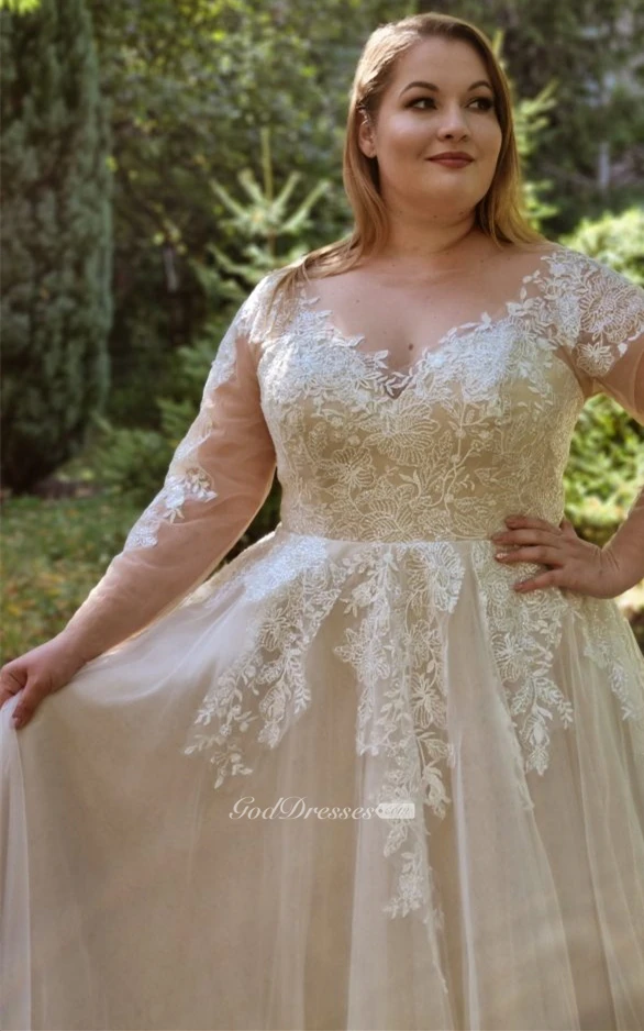 Glamorous A Line Tulle V-neck Floor-length Wedding Dress with Appliques