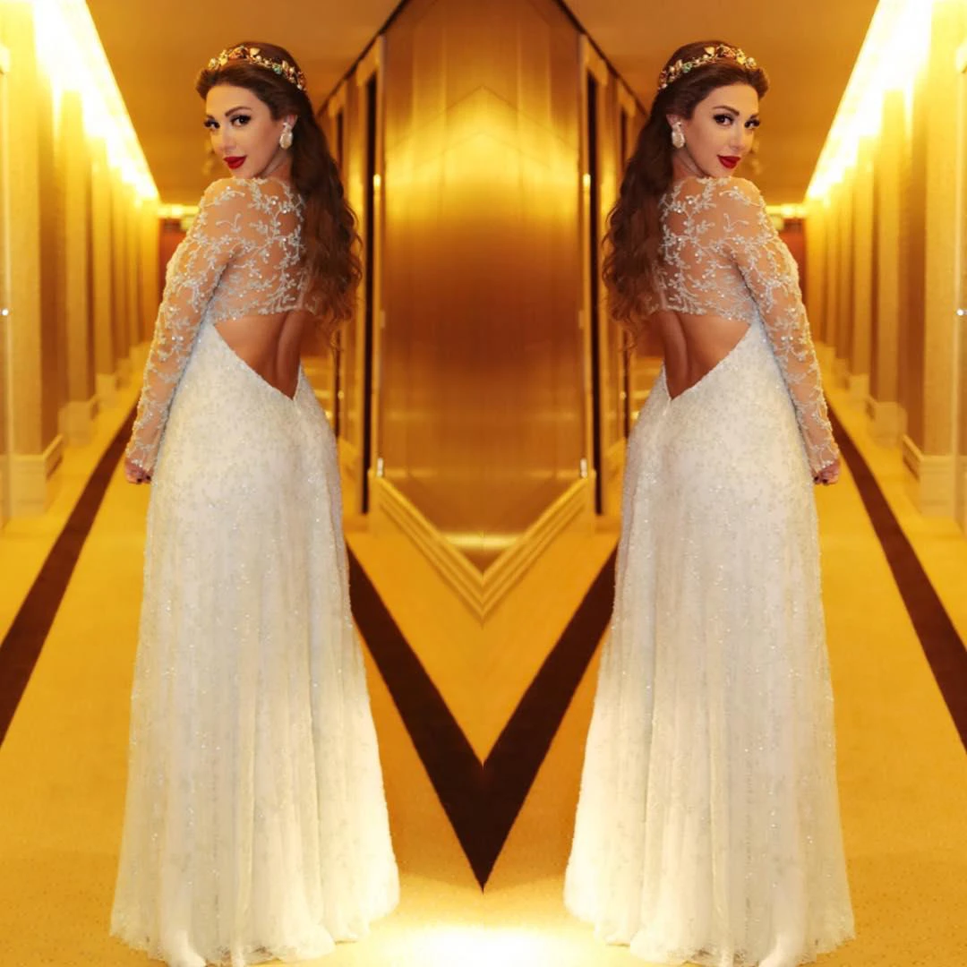 Glamorous Beadings Appliques A-line Evening Dress Long Sleeve