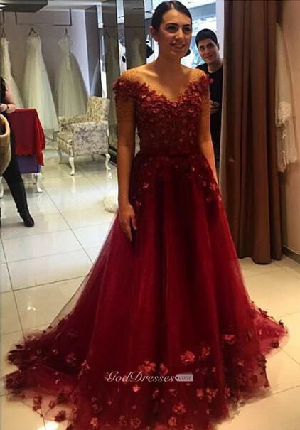 Glamorous Off-the-Shoulder Burgundy A-Line Prom Dresses Tulle Appliques