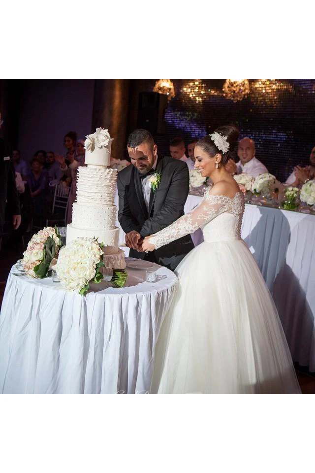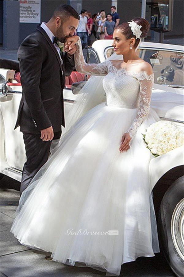 Glamorous Off-the-shoulder Lace Ball Gown Wedding Dress Tulle Button Back