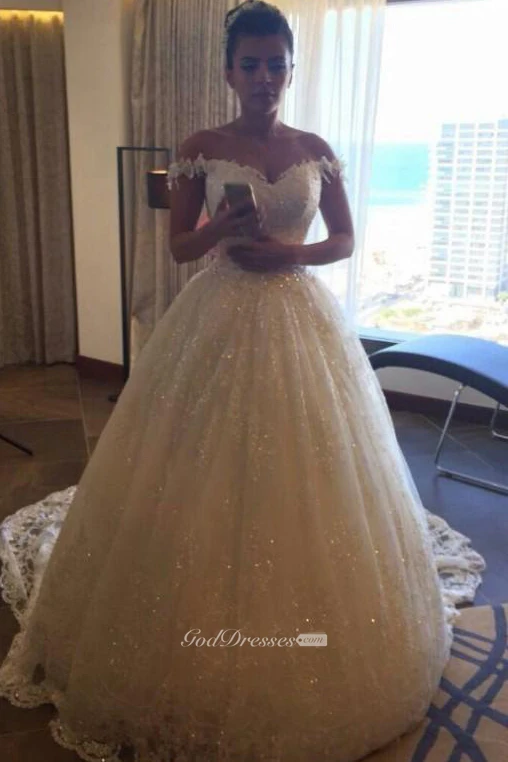 Glamorous Princess Sequined Tulle Wedding Dress Lace Appliques Off-the-shoulder
