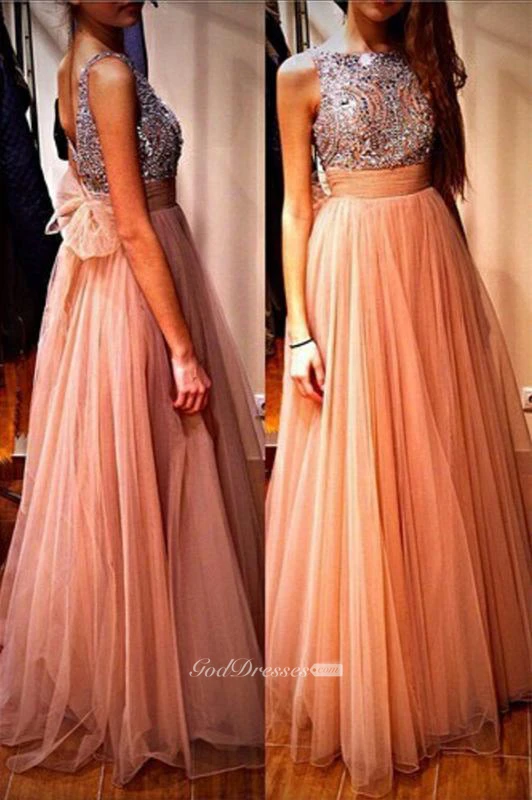 Glamorous Tulle Beadings Crystals Prom Dress Long Bowknot Back