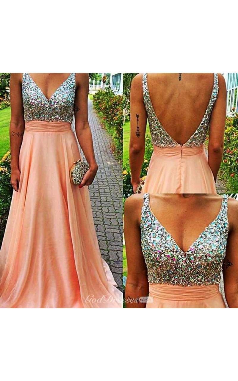 Glamorous V-neck Sleeveless Chiffon Prom Dress With Crystals