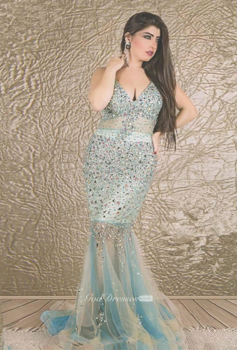 Glamorous V-neck Sleeveless Mermaid Prom Dress With Crystals