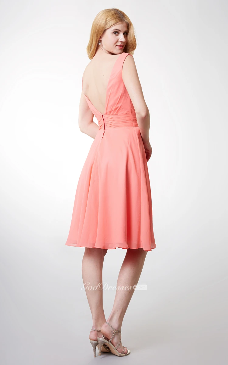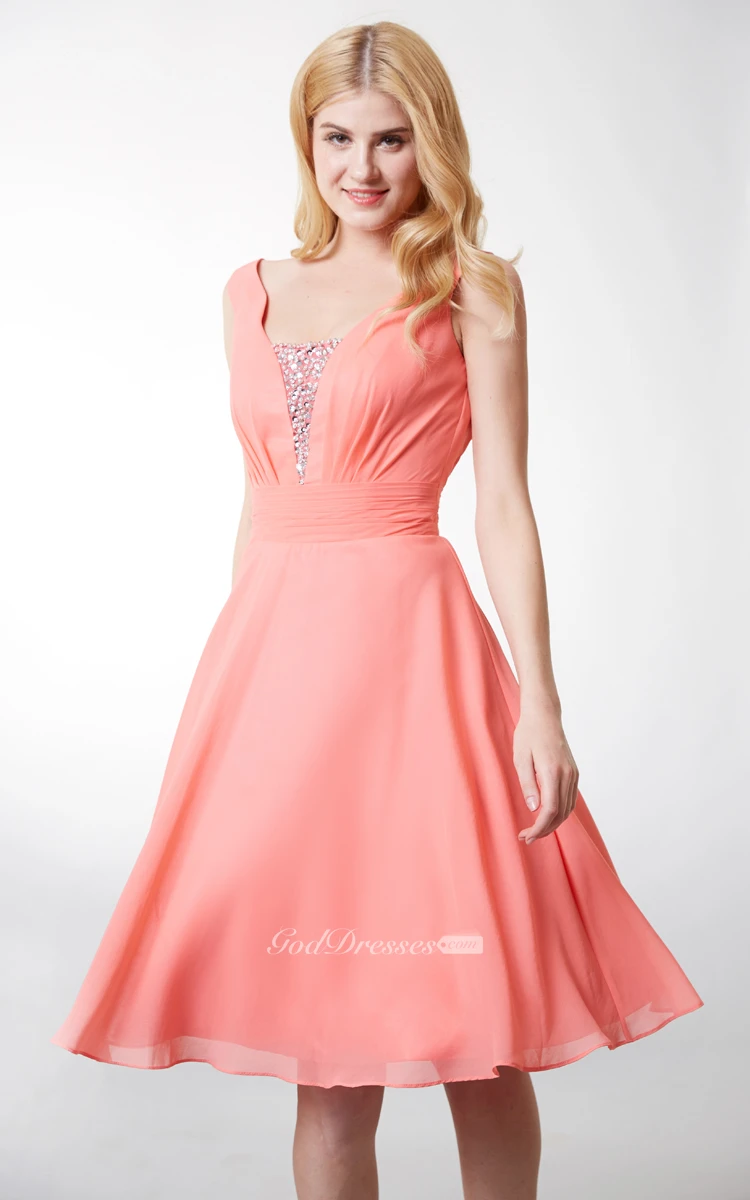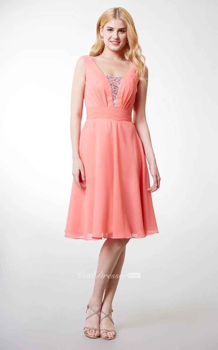 Glittering Scoop Neck Knee Length Chiffon Dress With Beaded Detailing