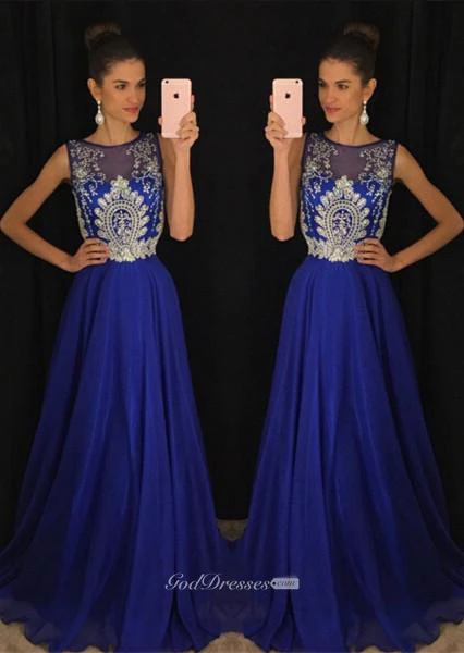 Gorgeous Dark Royal Blue Sleeveless Evening Dresses Long Chiffon With Appliques Beadings