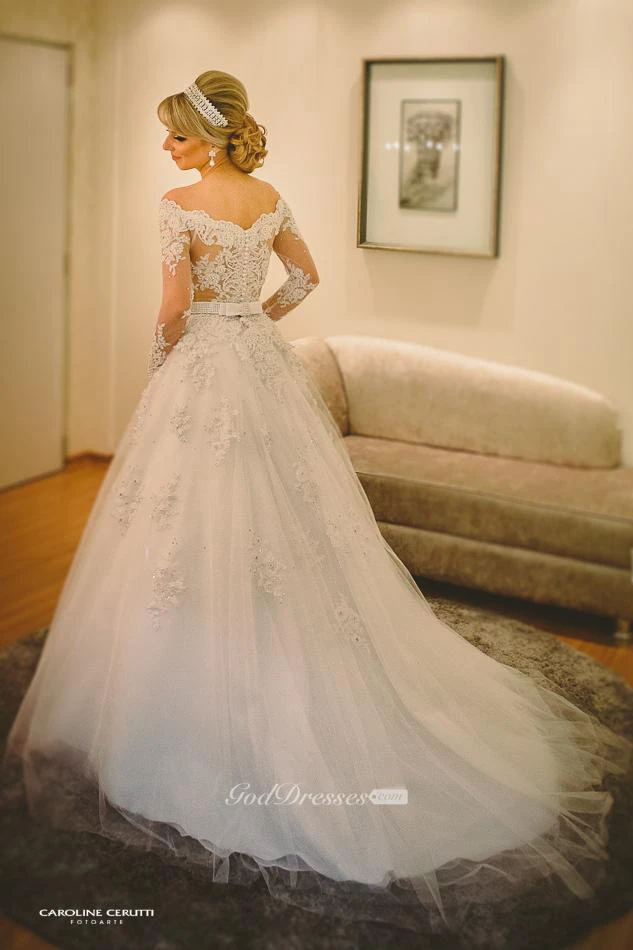 Gorgeous Lace Appliques Beadings Tulle Wedding Dress Long Sleeve