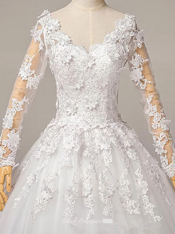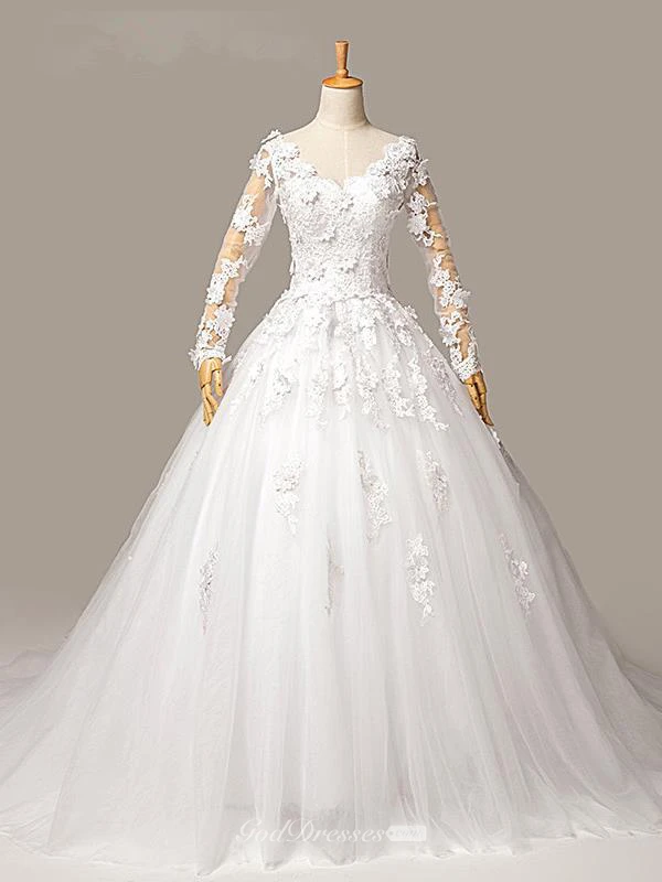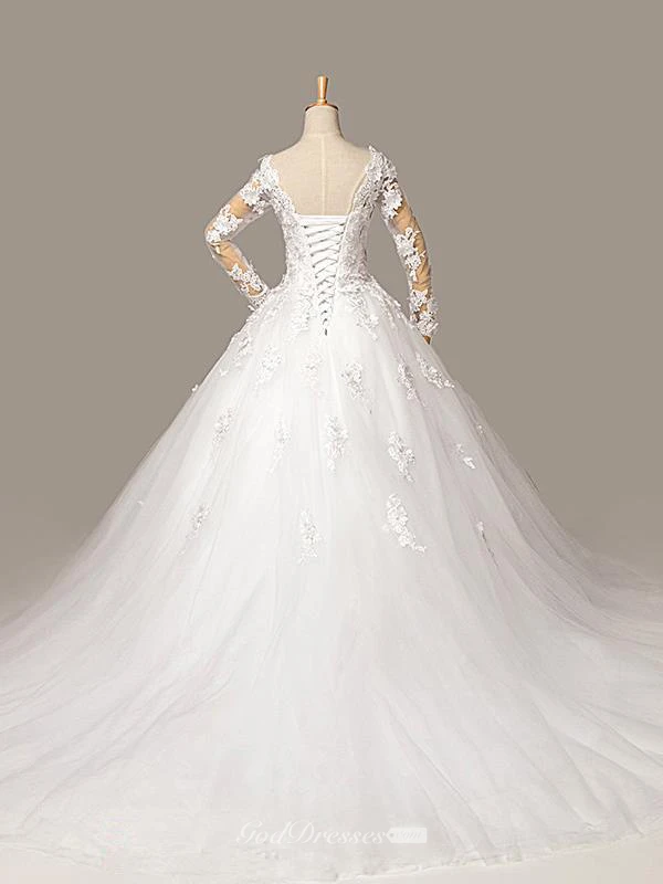 Gorgeous Long Sleeve Appliques Tulle Wedding Dresses Ball Gown Lace-up